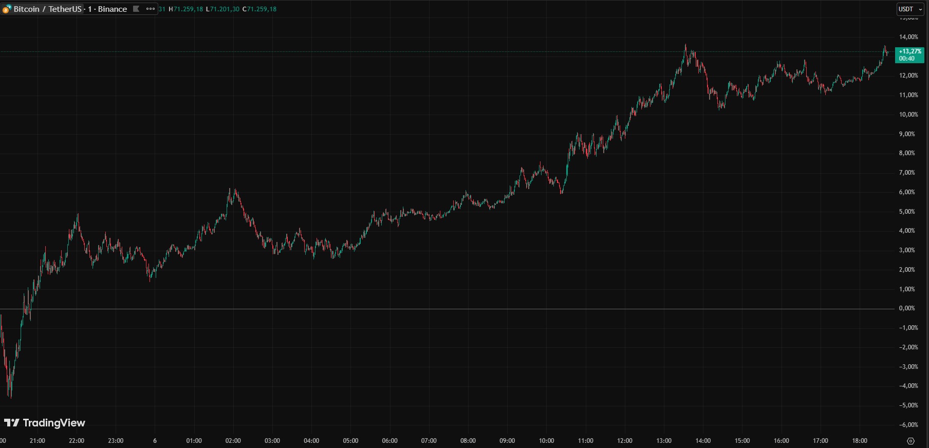 Sin embargo, al cierre de esta edición, bitcoin cotiza en 70.992 dólares, según la Calculadora de Precios de CriptoNoticias. Esto representa un repunte del 13 % en un solo día, en promedio. Así se aprecia en el siguiente gráfico: