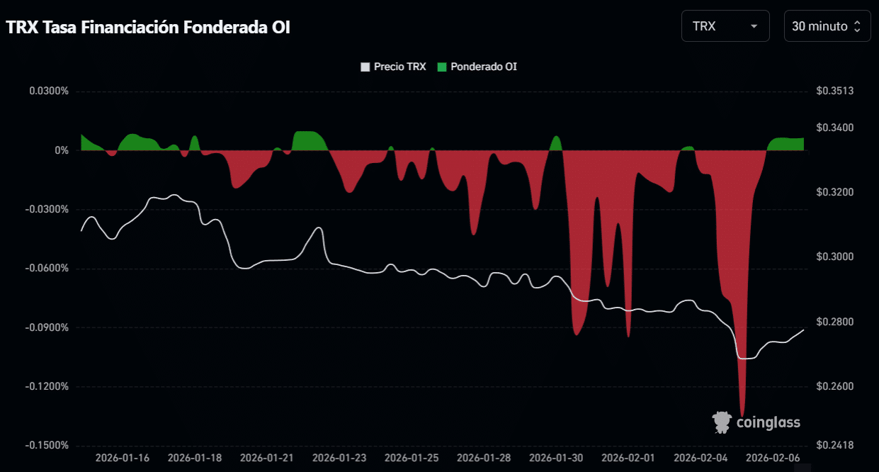 El gráfico de funding rates de TRON ($TRX) refleja con claridad el deterioro que experimentó el activo durante las últimas semanas. Desde mediados de enero, cuando $TRX cotizaba por encima de los $0,33, el indicador comenzó a inclinarse de forma sostenida hacia terreno negativo.