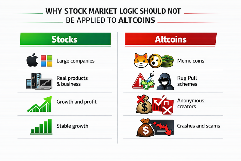 Muchos llegan al mundo crypto con experiencia en el mercado de valores y aplican la misma lógica: «Si una empresa es buena, hay que comprar más en las caídas - con el tiempo el precio subirá». Esta estrategia funciona con Apple, Microsoft, Google o NVIDIA porque detrás de esas acciones hay negocios reales con productos, ingresos, informes financieros, accionistas e intereses a largo plazo de la gerencia.