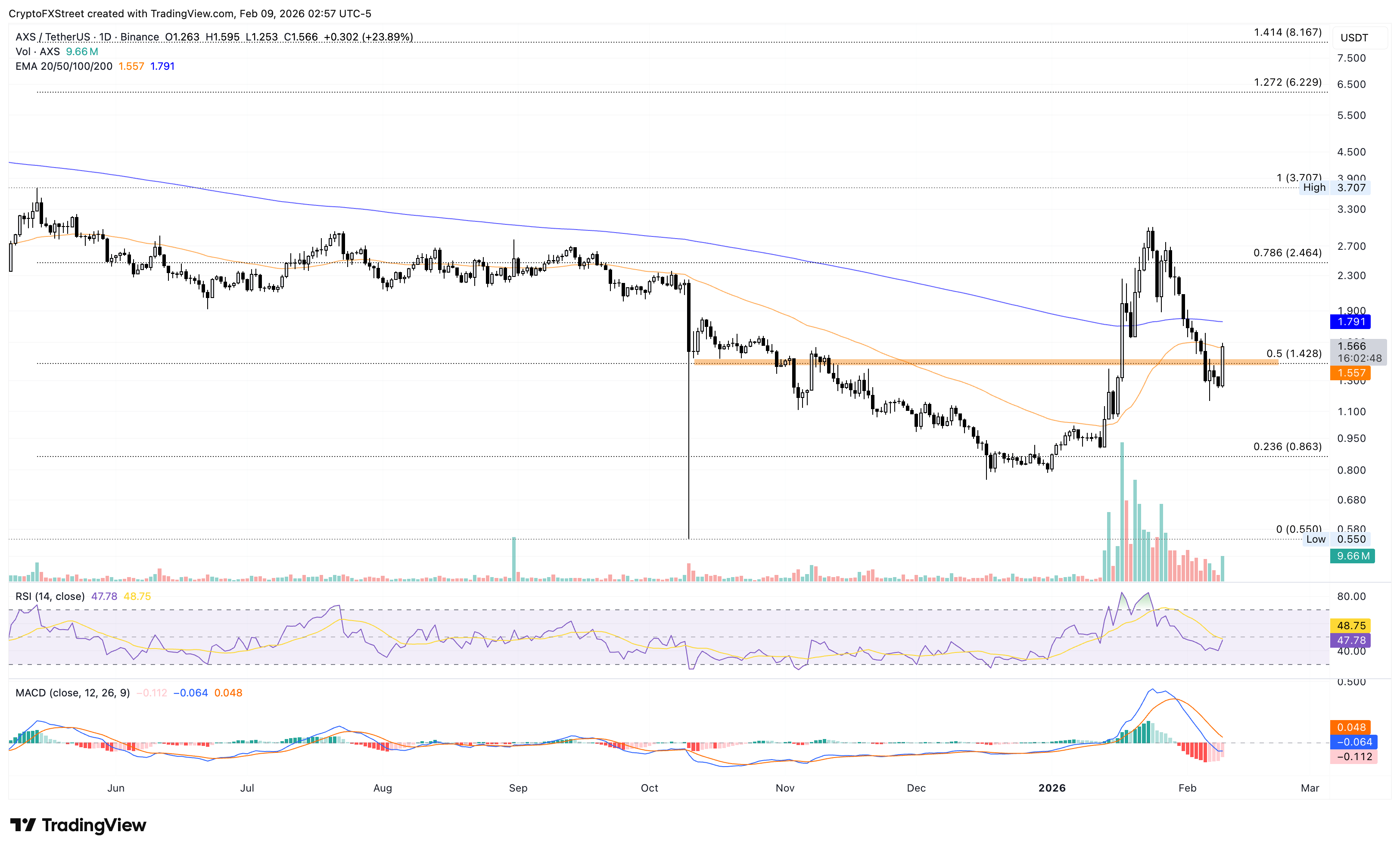 Si $AXS supera la EMA de 50 días en 1.55$, podría extender las ganancias hacia la EMA de 200 días en 1.79$.
