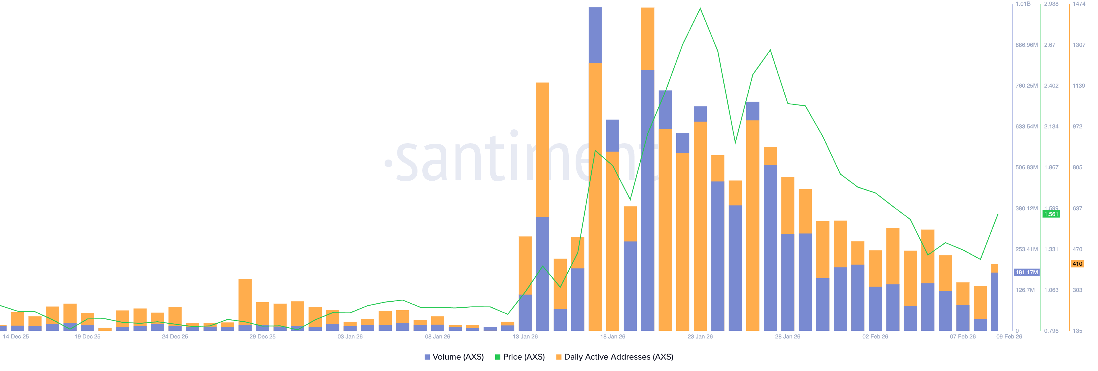 Además, el volumen de operaciones alcanzó más de 181 millones de $AXS el lunes, frente a 36.67 millones del día anterior. Típicamente, un aumento en el volumen de operaciones que respalda una recuperación incrementa la probabilidad de ganancias extendidas.