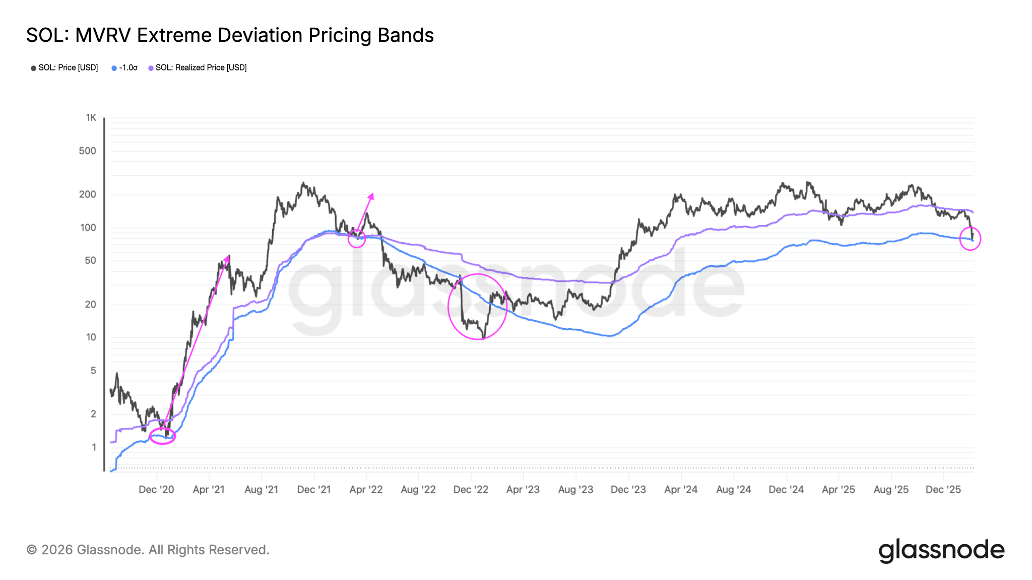 Históricamente, los precios de $SOL caen hasta cerca o incluso por debajo de la banda MVRV más baja antes de tocar fondo.
