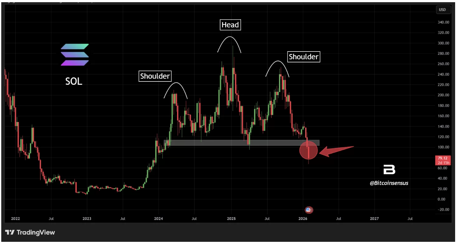 $SOL ha perdido más del 72% de su valor desde su pico de ciclo de aproximadamente $295 en enero de 2025. En este severo retroceso, han emergido patrones de “cabeza y hombros” distintos a través de diferentes marcos de tiempo. El analista de criptomonedas, Bitcoinsensus, comparte gráficos que indican que Solana ha confirmado este patrón a escala macro, continuando los riesgos a la baja. El objetivo, según las mediciones técnicas, se extiende al nivel de $50.