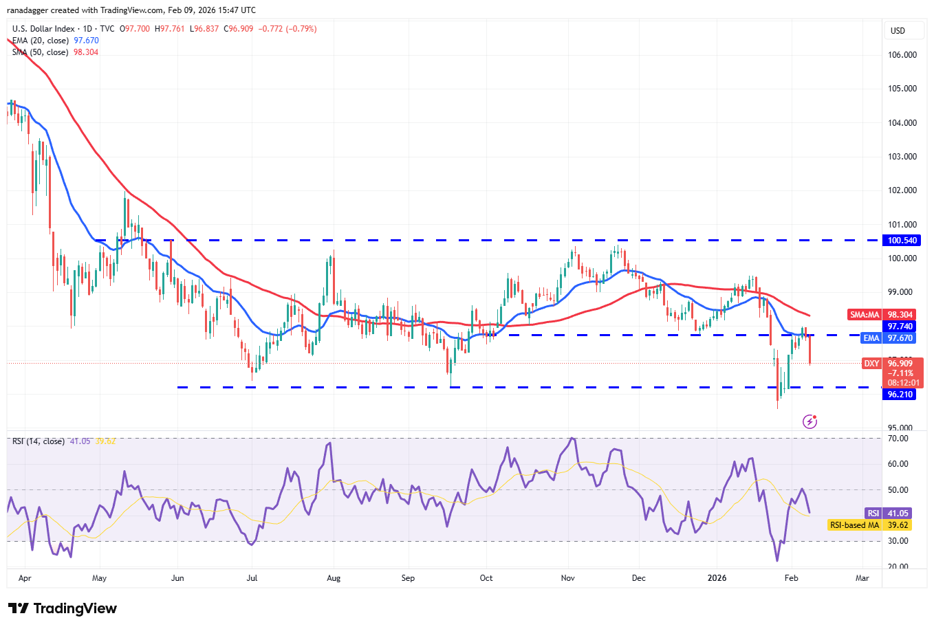 El precio se desplomó bruscamente por debajo de la EMA de 20 días el lunes, señalando que los bajistas están intentando tomar el control. Hay un fuerte soporte en la zona de soporte de 96,21 a 95,51, pero si los bajistas prevalecen, el índice podría desplomarse a 91,88.