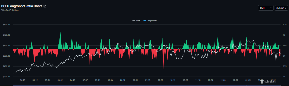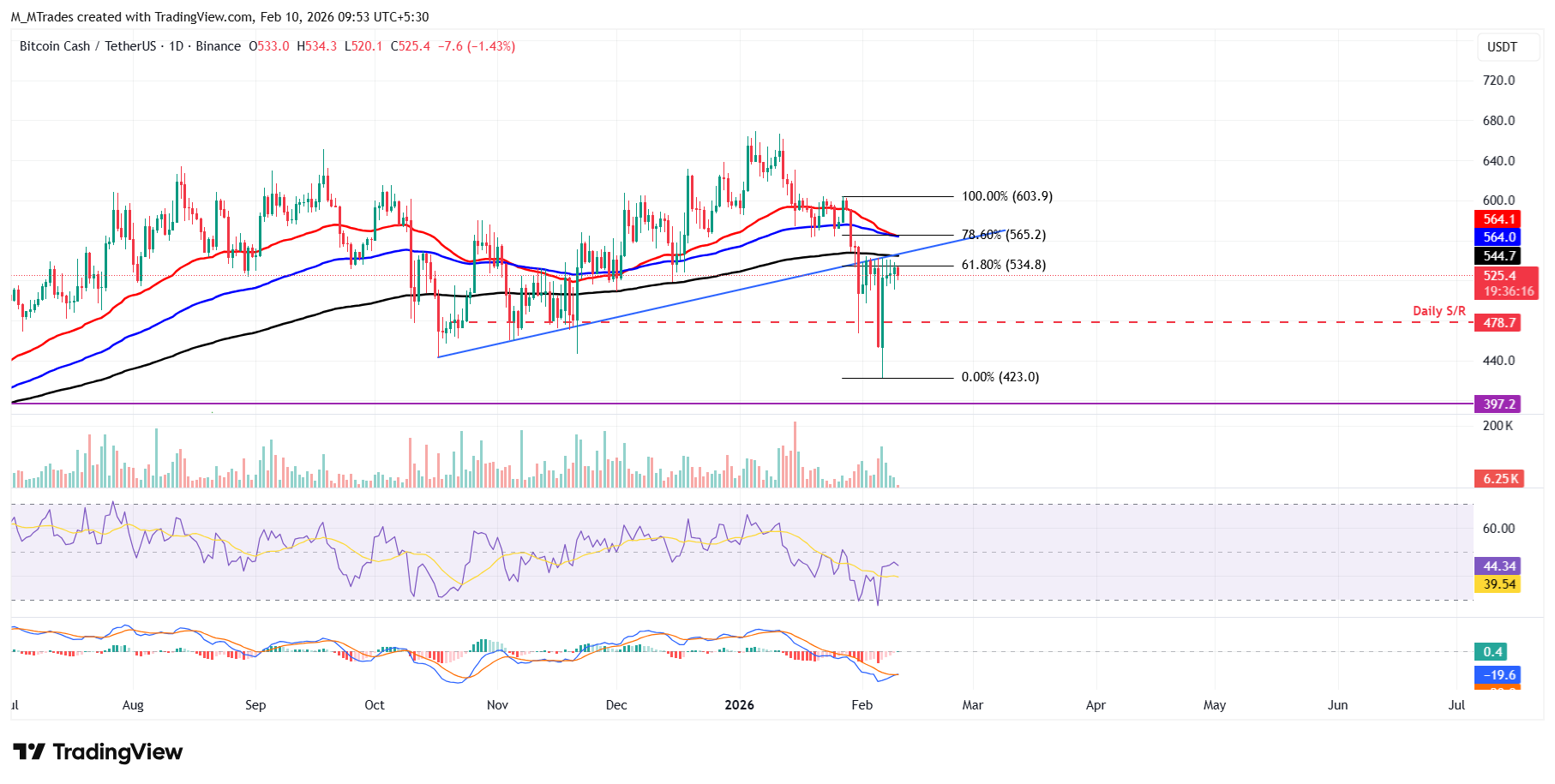 Además, la acción del precio actual sugiere un posible rebote de gato muerto —un breve aumento de precio dentro de una tendencia bajista más amplia— con $BCH cotizando a 525.40$ el martes.