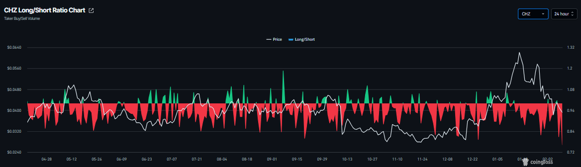 En el lado de los derivados, los datos de Coinglass muestran que la relación larga-corta de $CHZ está en 0.76 el martes, el nivel más bajo en más de un mes. Esta relación, al estar por debajo de uno, indica un sentimiento bajista en el mercado, ya que más operadores están apostando a que el precio de $CHZ caerá.