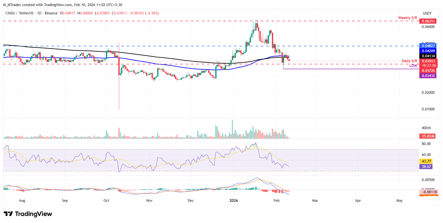 Si $CHZ continúa su tendencia a la baja, podría extender la corrección hacia el soporte diario en 0.037$.