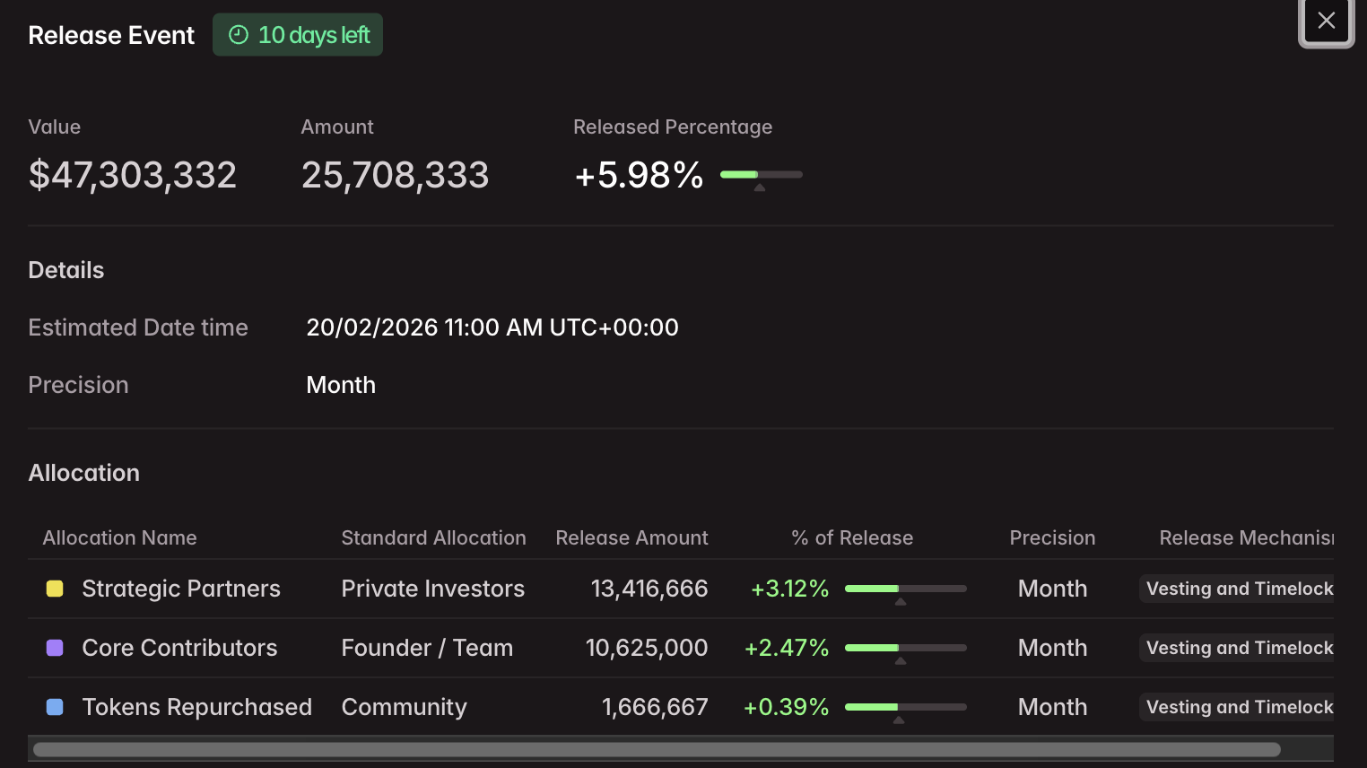 LayerZero ($ZRO) sigue siendo uno de los activos criptográficos de mejor rendimiento en los últimos siete días, aumentando casi un 7% en el momento de la publicación el martes. La capa de mensajería entre cadenas se recupera en medio de un intenso interés minorista, a pesar de una fuerte disminución en la actividad en cadena. Sin embargo, los 25.70 millones de tokens programados para desbloquearse el 20 de febrero añaden riesgo a la baja.