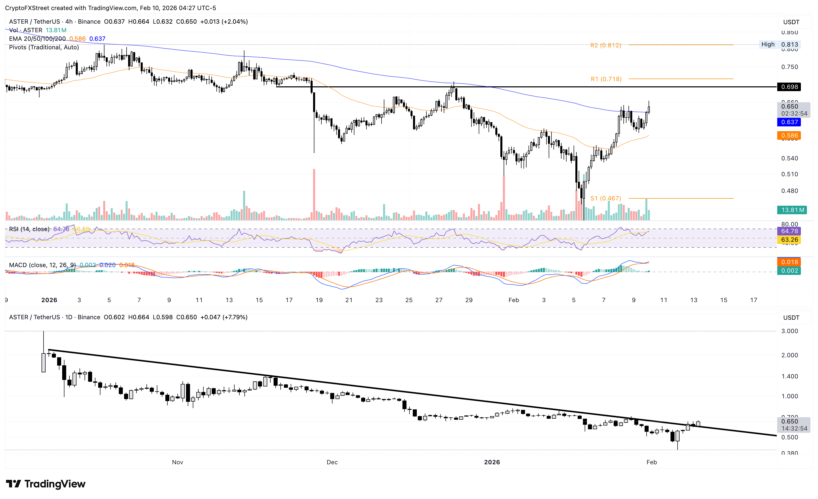 Aster se cotiza por encima de 0.630$ en el momento de la publicación el jueves, probando una línea de tendencia de resistencia crucial que conecta los máximos del 7 de octubre y del 19 de noviembre en el gráfico diario. Un cierre decisivo por encima de 0.630$ confirmaría la ruptura de la línea de tendencia y abriría la puerta a más alzas.
