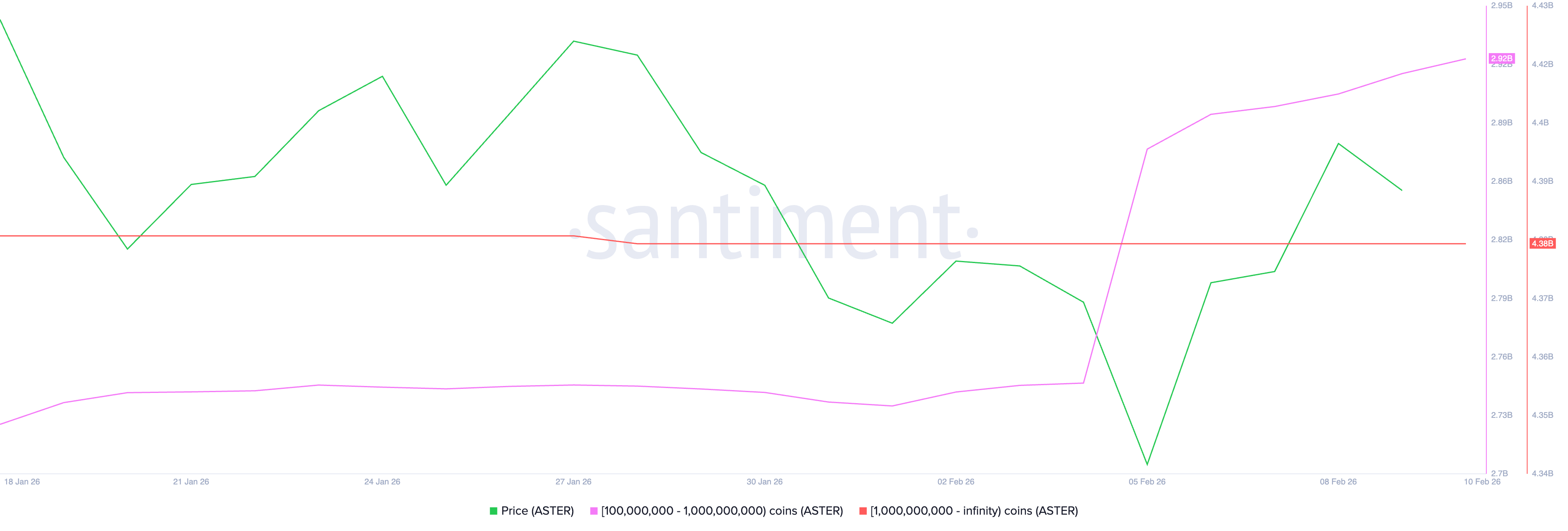 En el lado de la cadena, la distribución de suministro de $ASTER muestra un renovado interés entre las ballenas con 100 millones a 1 mil millones de tokens. Los datos de Santiment muestran que este grupo aumentó sus holdings a 9.22 mil millones de dólares desde 9.75 mil millones de dólares el jueves, apoyando el rebote en forma de V en $ASTER.