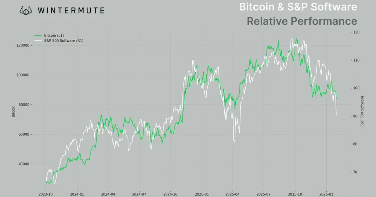 Un análisis adicional de la firma mostró que la resiliencia de los índices bursátiles durante las tendencias alcistas y las caídas del mercado se atribuye en gran medida a la rotación hacia la narrativa de la IA en lugar de a una fortaleza más amplia en todo el mercado de valores. Wintermute señaló que Bitcoin y las empresas de software del S&P 500 han operado en gran medida en un patrón similar durante los últimos dos años.