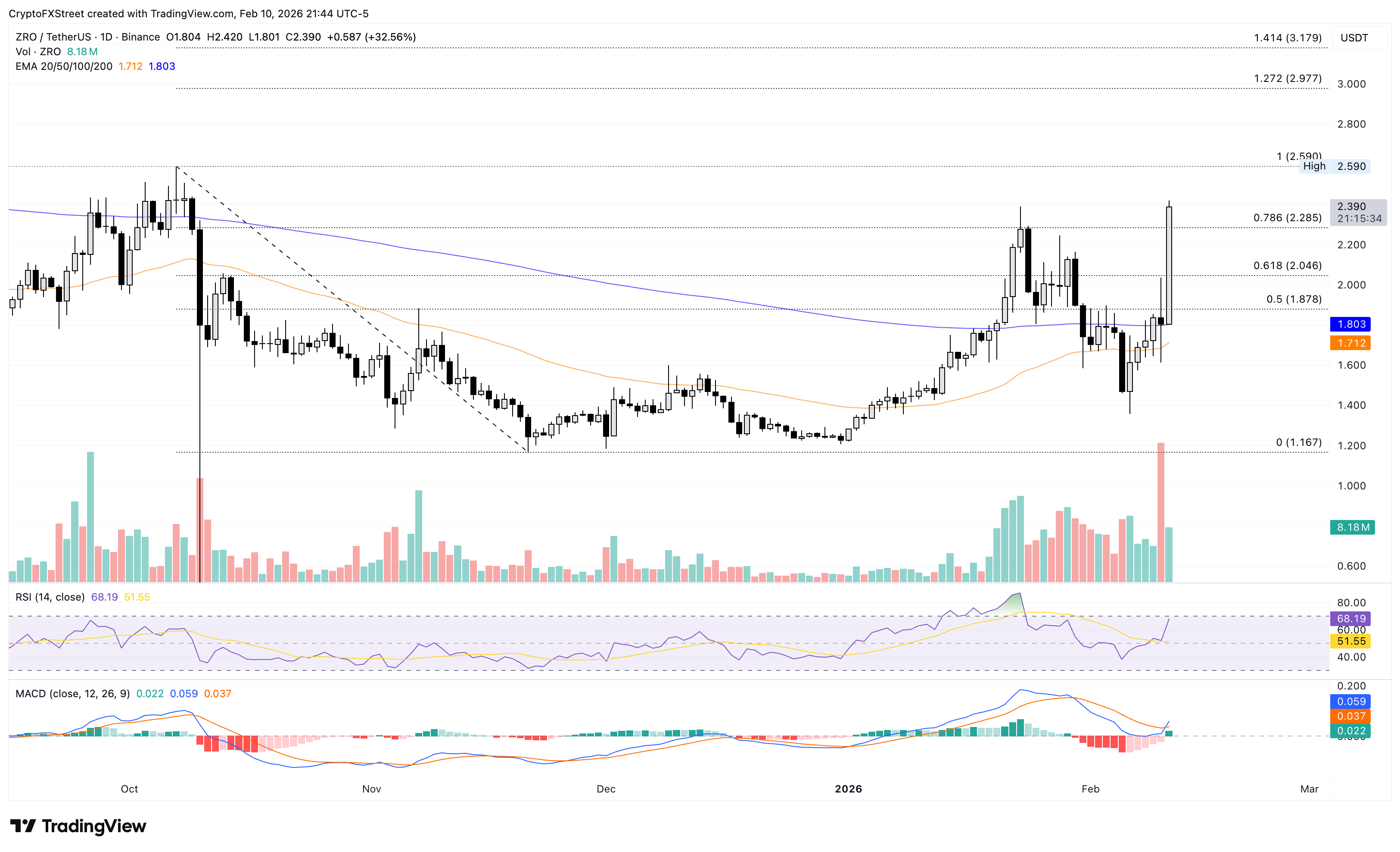 El token $ZRO ha superado el nivel de retroceso de Fibonacci del 78.6% en 2.28$, medido desde el máximo del 7 de octubre en 2.59$ hasta el mínimo del 21 de noviembre en 1.16$. Un cierre decisivo por encima de 2.28$ probablemente extendería este rally hacia 2.59$, mientras que la siguiente resistencia se encuentra en la extensión de Fibonacci 1.272 en 2.97$.