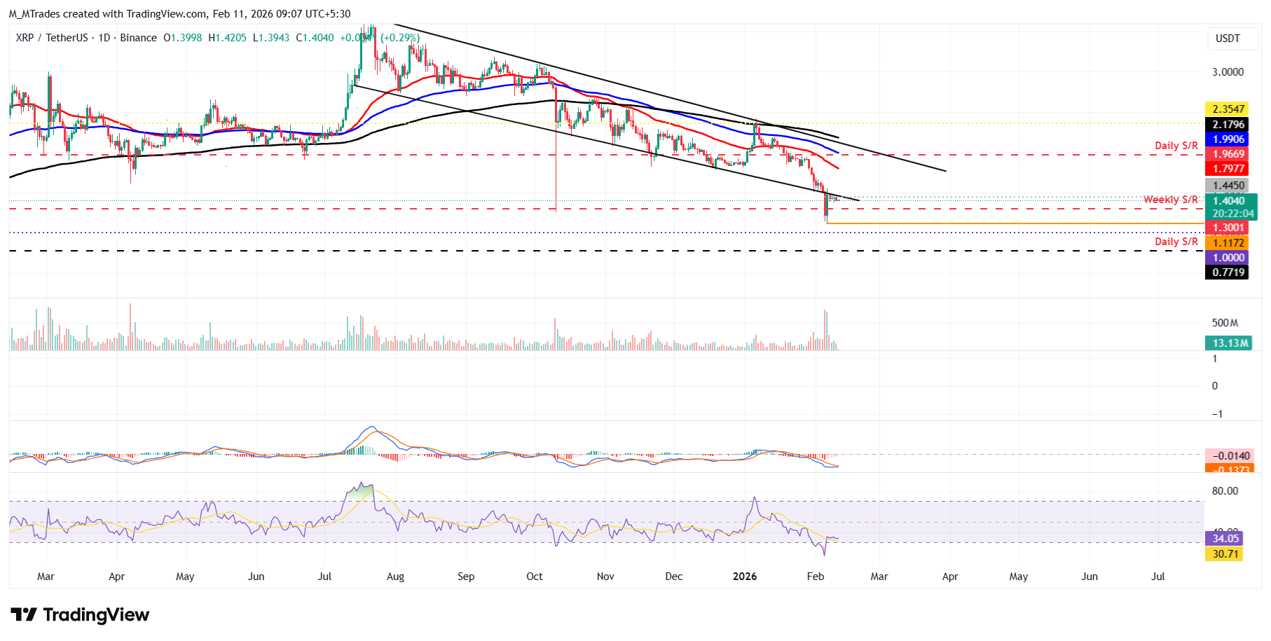 $XRP revisó el límite de la línea de tendencia rota de una cuña descendente el viernes y ha estado enfrentando rechazo alrededor de este nivel hasta el martes. A partir del miércoles, $XRP cotiza por debajo de 1.40$.