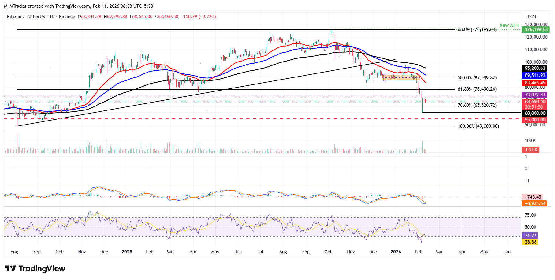 Si $BTC continúa su tendencia a la baja, podría extender la caída hacia el retroceso de Fibonacci del 78.6% (dibujado desde el mínimo de agosto de 2024 de 49.000$ hasta el máximo histórico de octubre de 2025 de 126.199$) en 65.520$.