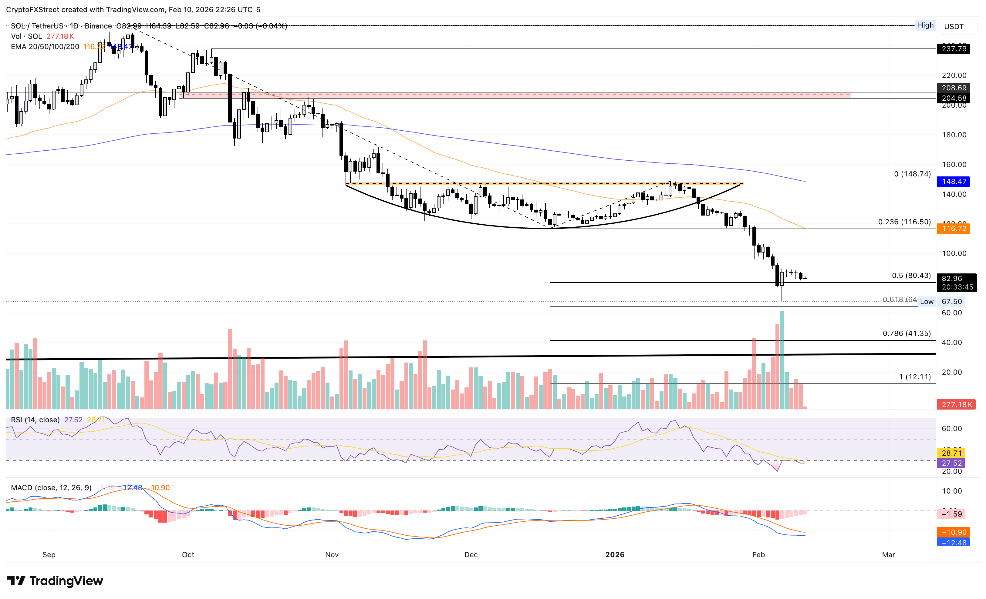 Solana cotiza a 82$ en el momento de la publicación el miércoles, acercándose a 80$ a medida que la presión a la baja añade peso muerto a su recuperación. $SOL está muy por debajo de la media móvil exponencial (EMA) de 50 días, que está inclinada a la baja, indicando una estructura bajista. La EMA de 200 días también tiende a bajar, reforzando el sesgo a la baja más amplio.