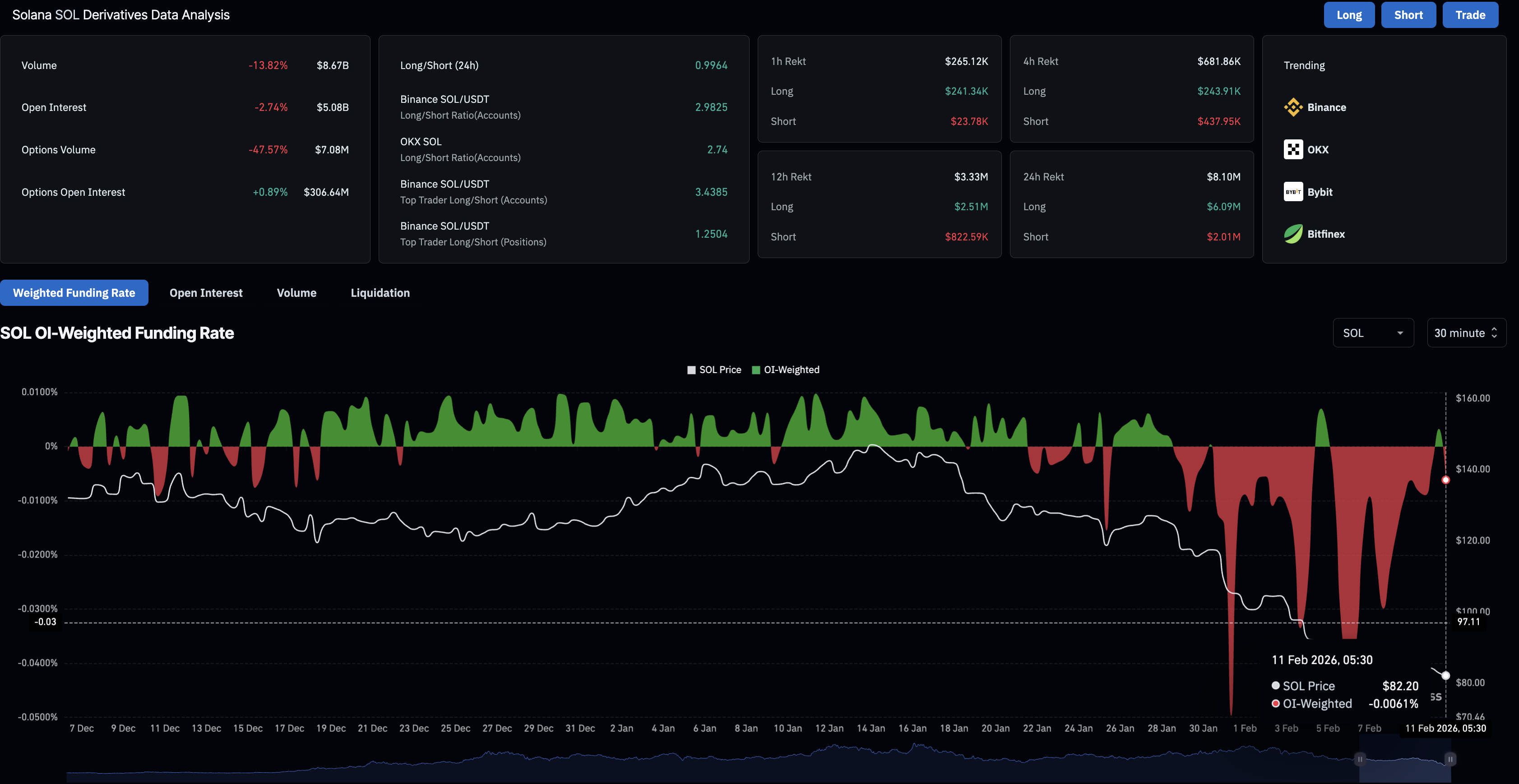 En el lado de los derivados, los datos de CoinGlass muestran que el Interés Abierto (OI) de futuros de $SOL disminuyó un 2,74% en las últimas 24 horas a 5.080 millones de dólares, indicando salidas de capital y reforzando el sentimiento averso al riesgo entre los operadores.
