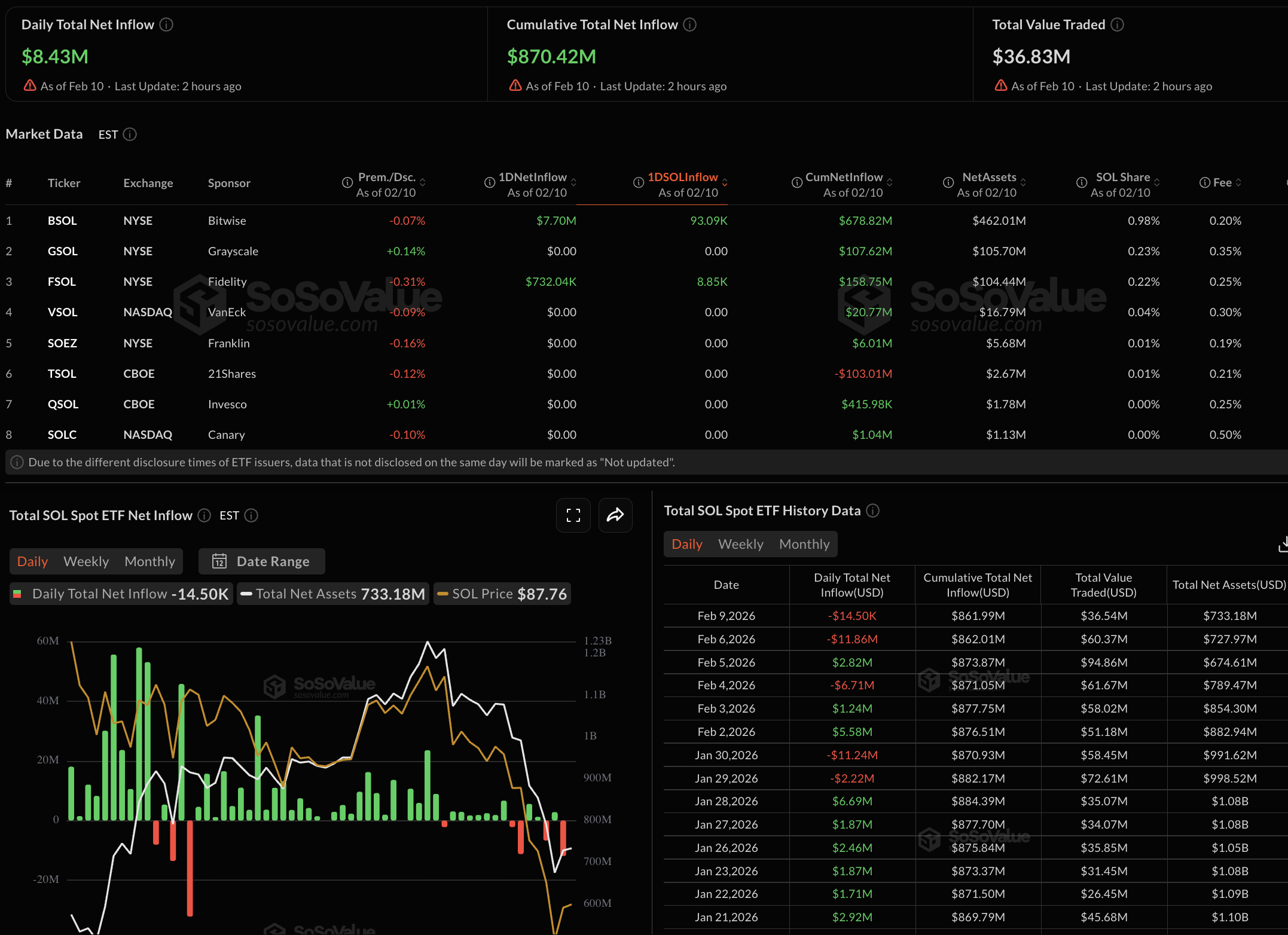 La demanda institucional sobrevive para Solana, ya que los ETFs de $SOL al contado en EE.UU. registraron 8,43 millones de dólares en entradas el martes. Las entradas constantes en niveles más bajos podrían ayudar a Solana a tocar fondo y prepararse para una reversión de tendencia.