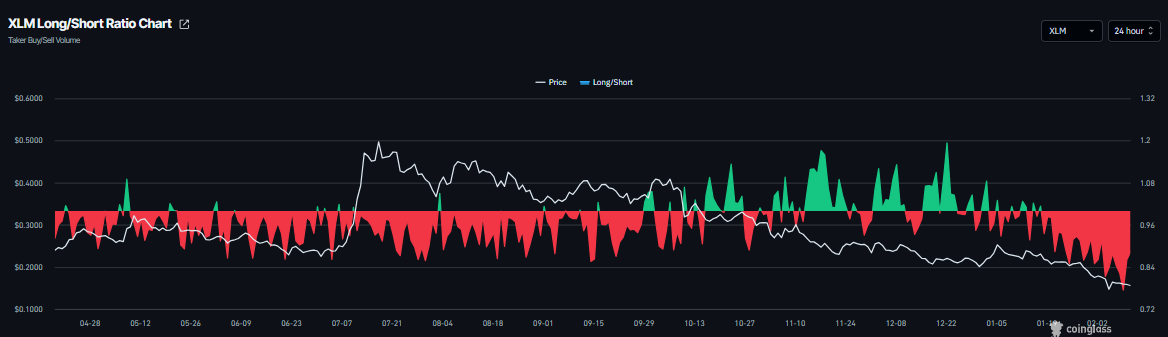 Los datos de derivados para Stellar apoyan una perspectiva bajista. La relación larga-corta de $XLM está en 0.77 el miércoles, el nivel más bajo en más de un mes. Esta relación, al estar por debajo de uno, indica un sentimiento bajista en el mercado, ya que más operadores están apostando a que el precio de $XLM caerá.