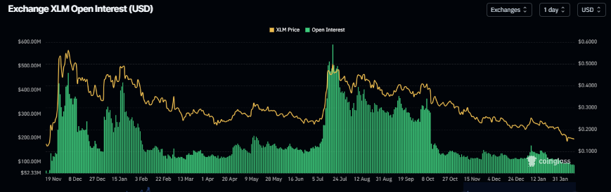 Además, el Interés Abierto (OI) de futuros de $XLM cae a 87.07 millones de dólares el miércoles, alcanzando niveles no vistos desde mediados de noviembre de 2024, y ha estado cayendo constantemente desde el máximo del 6 de enero de 166.99 millones de dólares. Esta caída en el OI refleja una disminución en la participación de los inversores y proyecta una perspectiva bajista.
