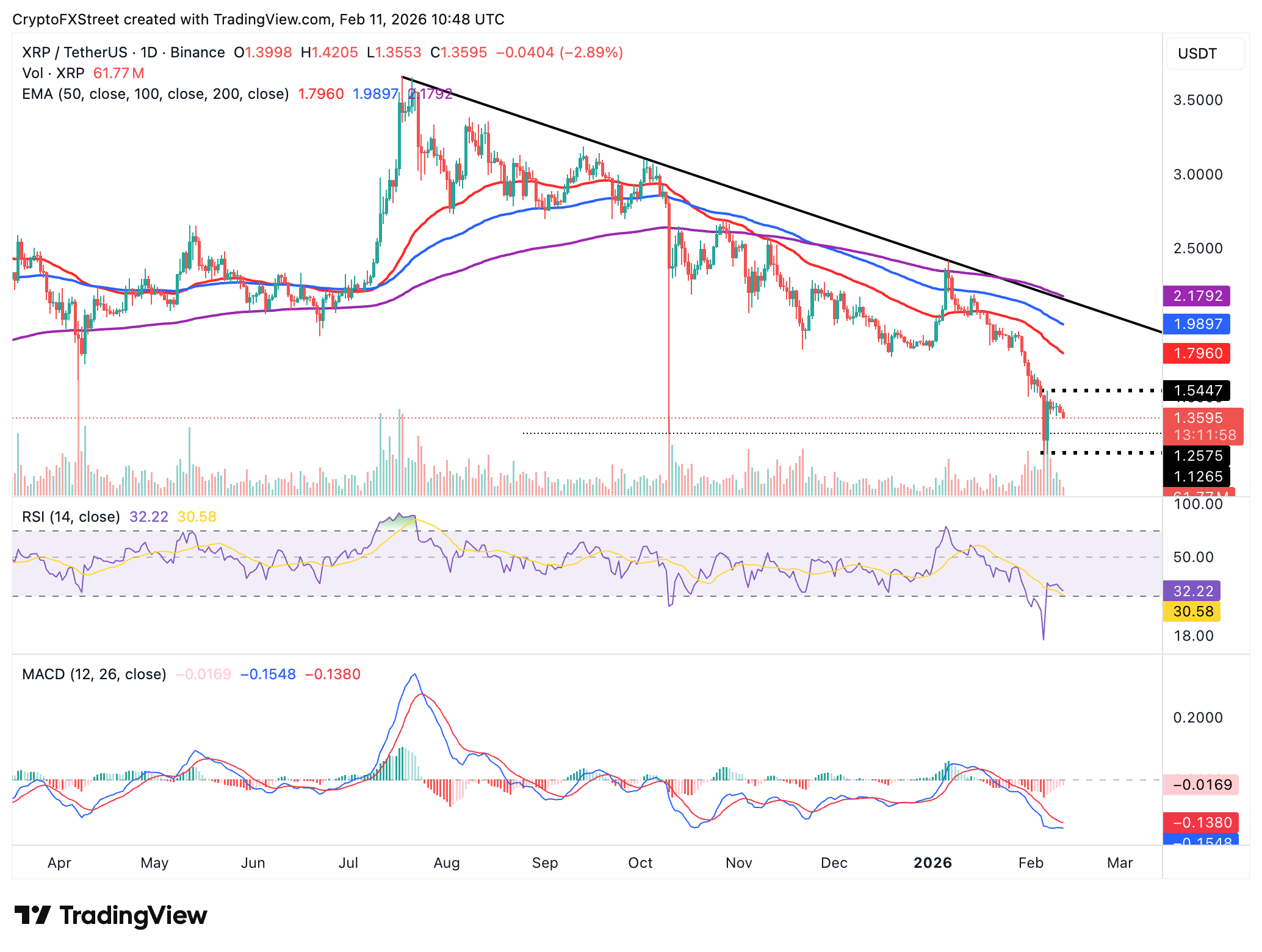 Ripple ($XRP) está bajando alrededor de 1.36$ en el momento de escribir este artículo el miércoles, presionado por el bajo interés minorista y la incertidumbre macroeconómica, lo que acelera el sentimiento de aversión al riesgo.