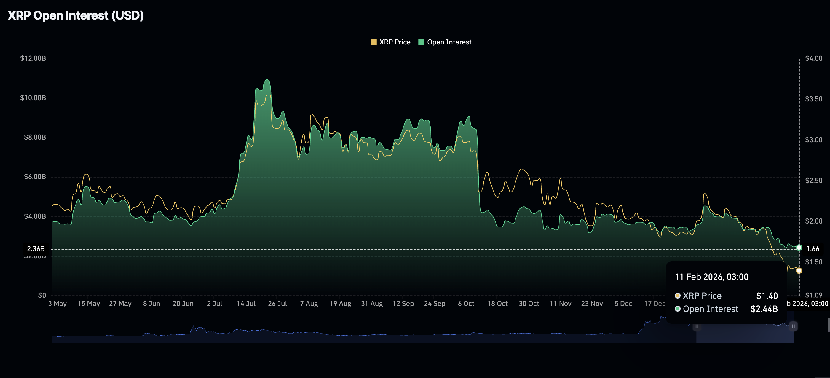 A pesar de la demanda institucional estable, el interés minorista en $XRP está a la baja, ya que el Interés Abierto (OI) de futuros cae a 2.44 mil millones de dólares el miércoles, ligeramente por debajo de los 2.5 mil millones del día anterior. El OI ha permanecido generalmente en una tendencia a la baja desde el máximo histórico de 10.94 mil millones de dólares en julio, lo que sugiere que los inversores carecen de confianza en la capacidad de $XRP para recuperarse y mantener una tendencia alcista.