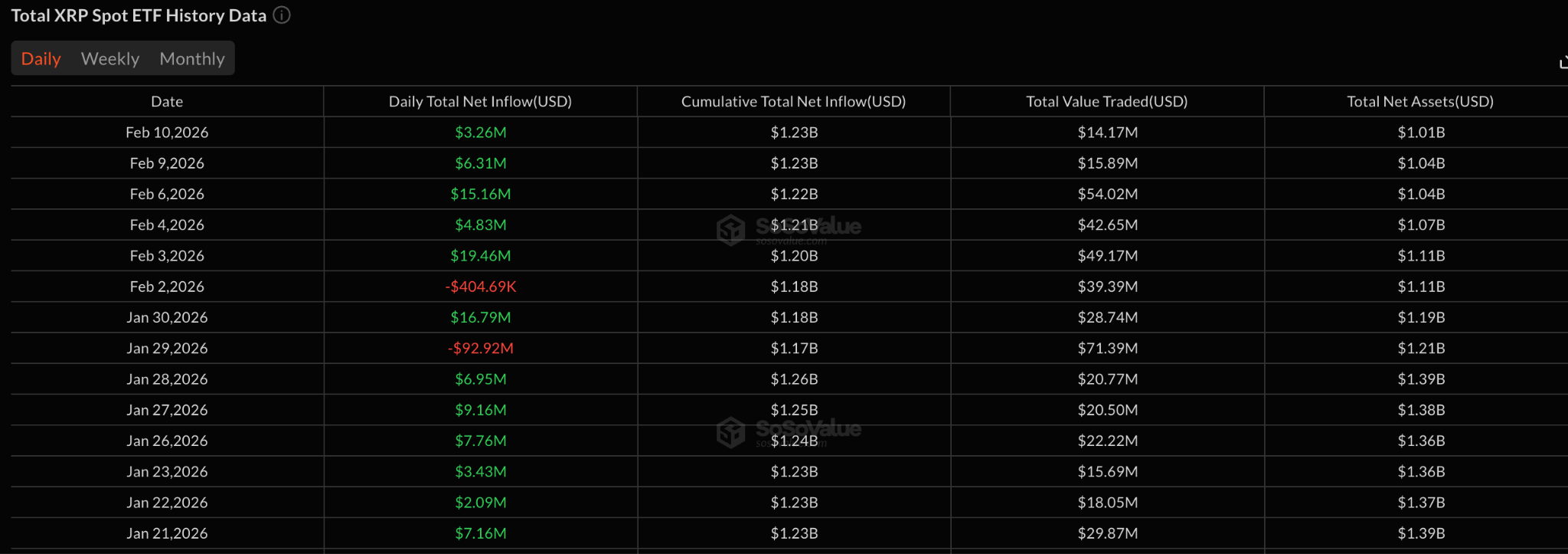 Lanzados a finales de 2025, los ETF al contado de $XRP han alcanzado ahora los USD 1.230 millones en entradas netas acumuladas. Las entradas de USD 3,26 millones del martes marcaron el quinto día consecutivo de entradas, lo que elevó el total de activos gestionados a USD 1.010 millones.
