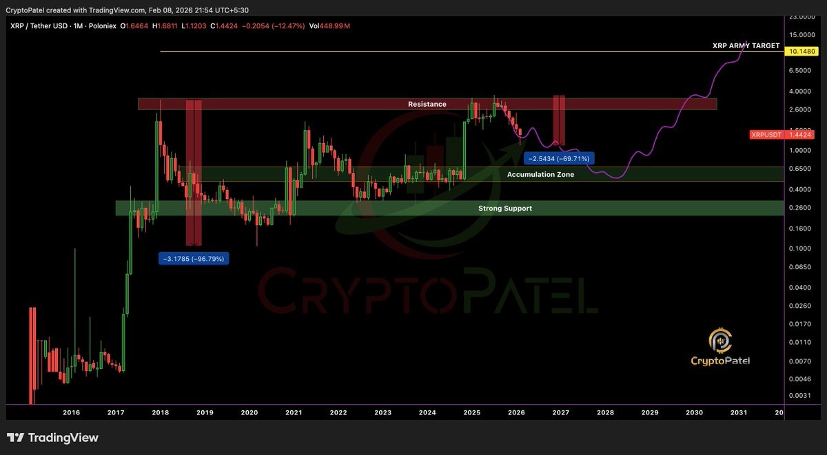 Por su parte, el analista Crypto Patel afirmó que, aunque una caída hasta USD 1 supondría una buena zona de entrada para los compradores de $XRP, la «mejor zona de acumulación» podría ser inferior, entre USD 0,50 y USD 0,70.