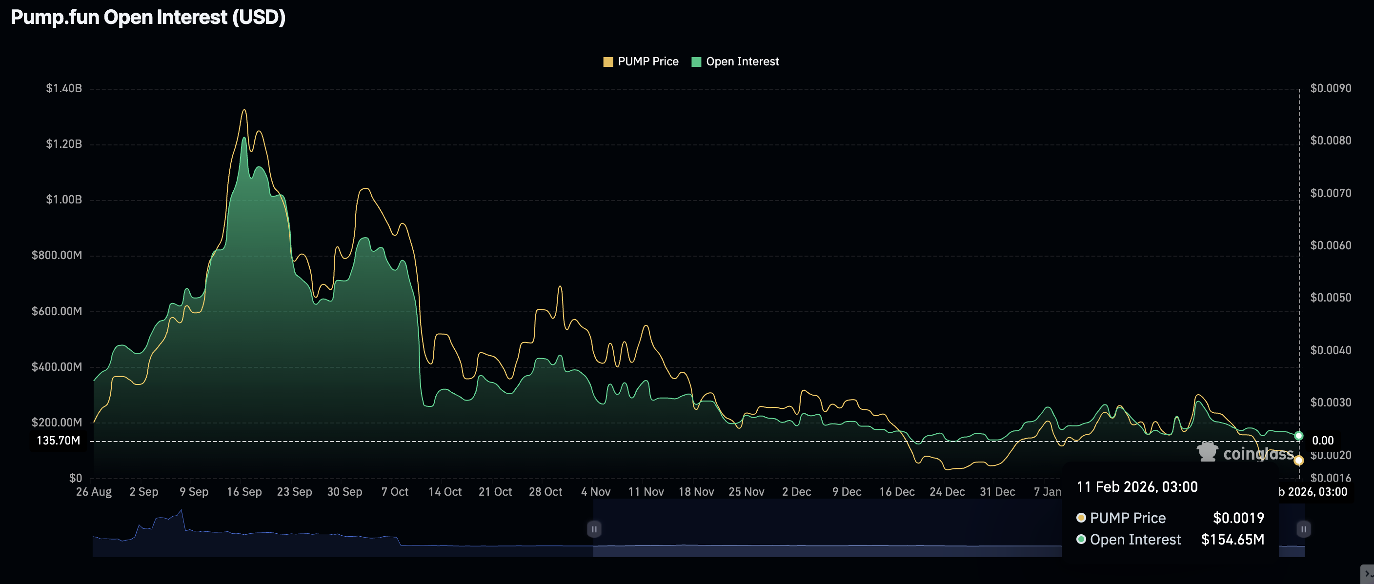 El dominante sentimiento de aversión al riesgo continúa manteniendo a los operadores al margen, reduciendo el sentimiento de los inversores, a medida que los derivados se debilitan. El interés abierto de futuros de Pump.fun (OI) se mantiene alrededor de los mínimos de diciembre de aproximadamente 155 millones de dólares el miércoles, bajando desde 162 millones de dólares el día anterior.