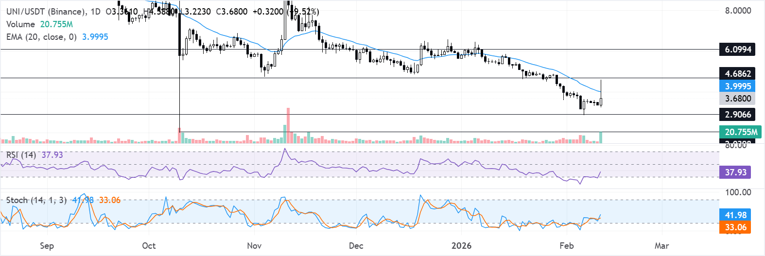 En el gráfico diario, $UNI/$USDT se negocia a 3.68$. La media móvil exponencial (EMA) de 20 días se inclina a la baja, preservando un sesgo bajista. El precio permanece limitado por debajo de la media, y los rebotes seguirían siendo frágiles hasta que un cierre diario lo recupere. La resistencia inmediata se alinea en 4.68$, y una ruptura clara por encima de esa barrera podría mejorar el tono a corto plazo y empujar a $UNI hacia 6.09$.