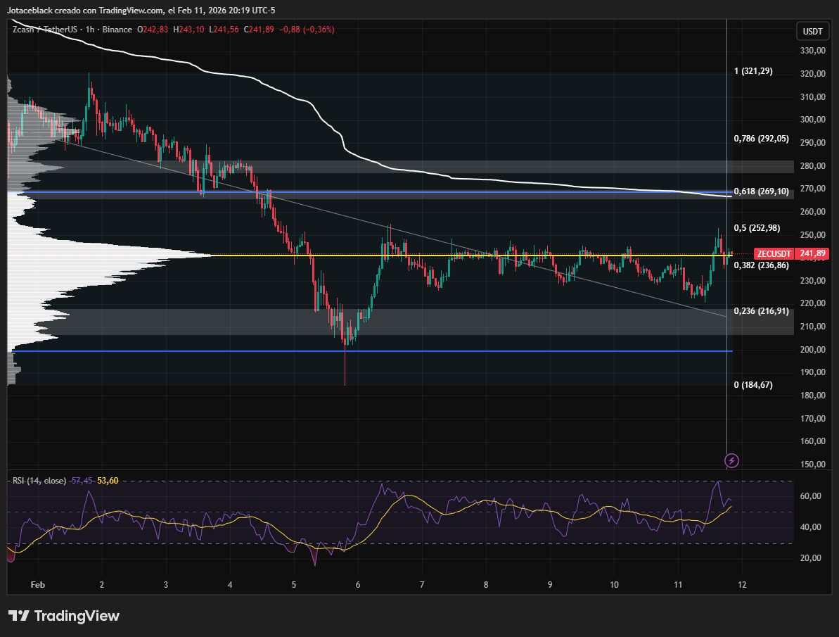 En las últimas velas se aprecia un intento de recuperación que acerca nuevamente a $ZEC a una resistencia clave ubicada en torno a los $270. Este nivel es especialmente relevante porque allí confluyen tres referencias técnicas de peso: el VWAP, el área de mayor interés del volume profile y el retroceso de Fibonacci 0,618.