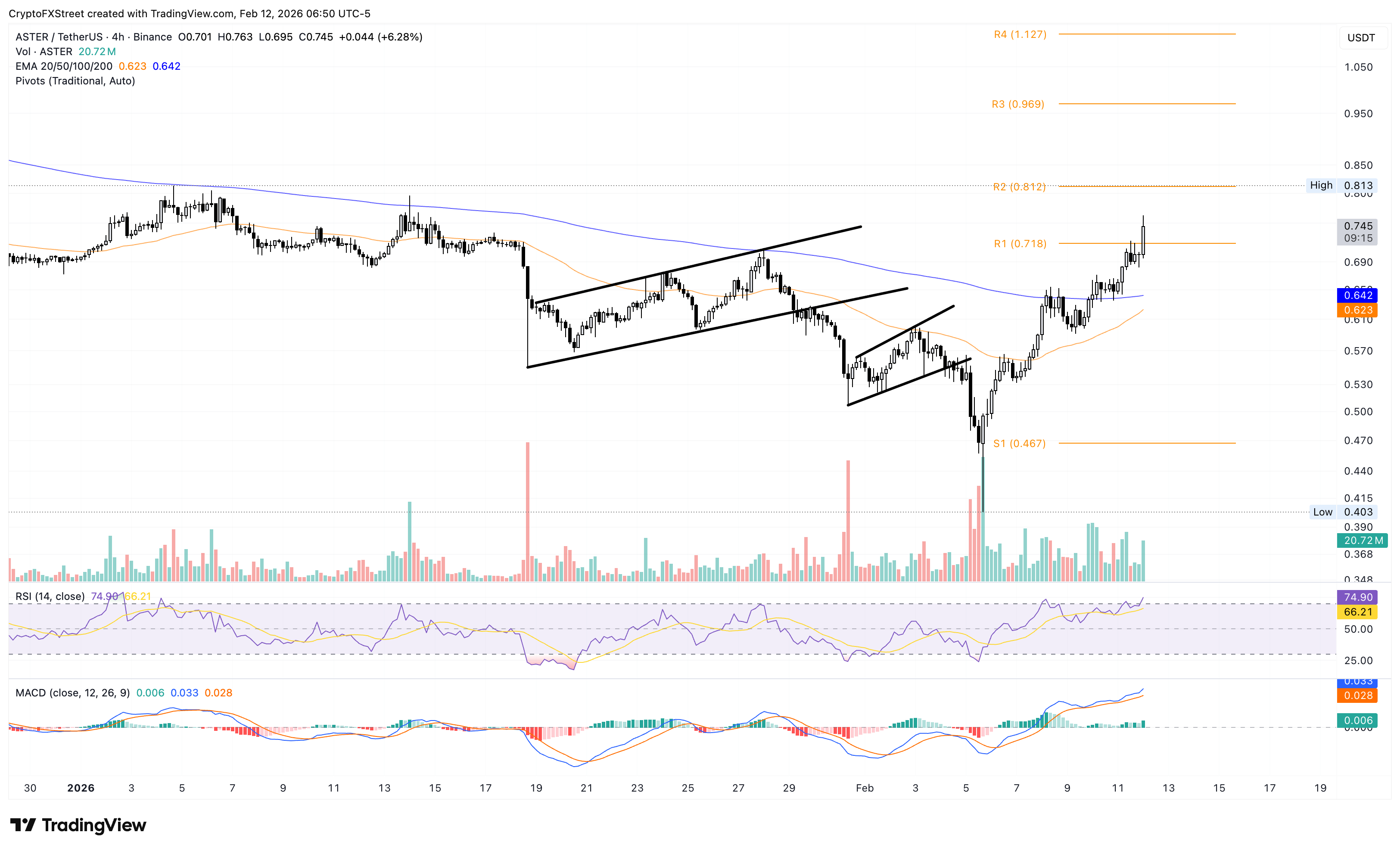 $ASTER se mantiene estable por encima de 0.740$ en el momento de la redacción el jueves, con ganancias de aproximadamente un 9% en el día. El token perp-DEX ha superado el punto de pivote R1 en 0.718$ en el gráfico de 4 horas, pero requiere un cierre de vela decisivo para confirmar la ruptura. Si $ASTER cierra por encima de este nivel, el rally podría extenderse al punto de pivote R2 en 0.812$, seguido de la resistencia en el punto de pivote R3 en 0.969.