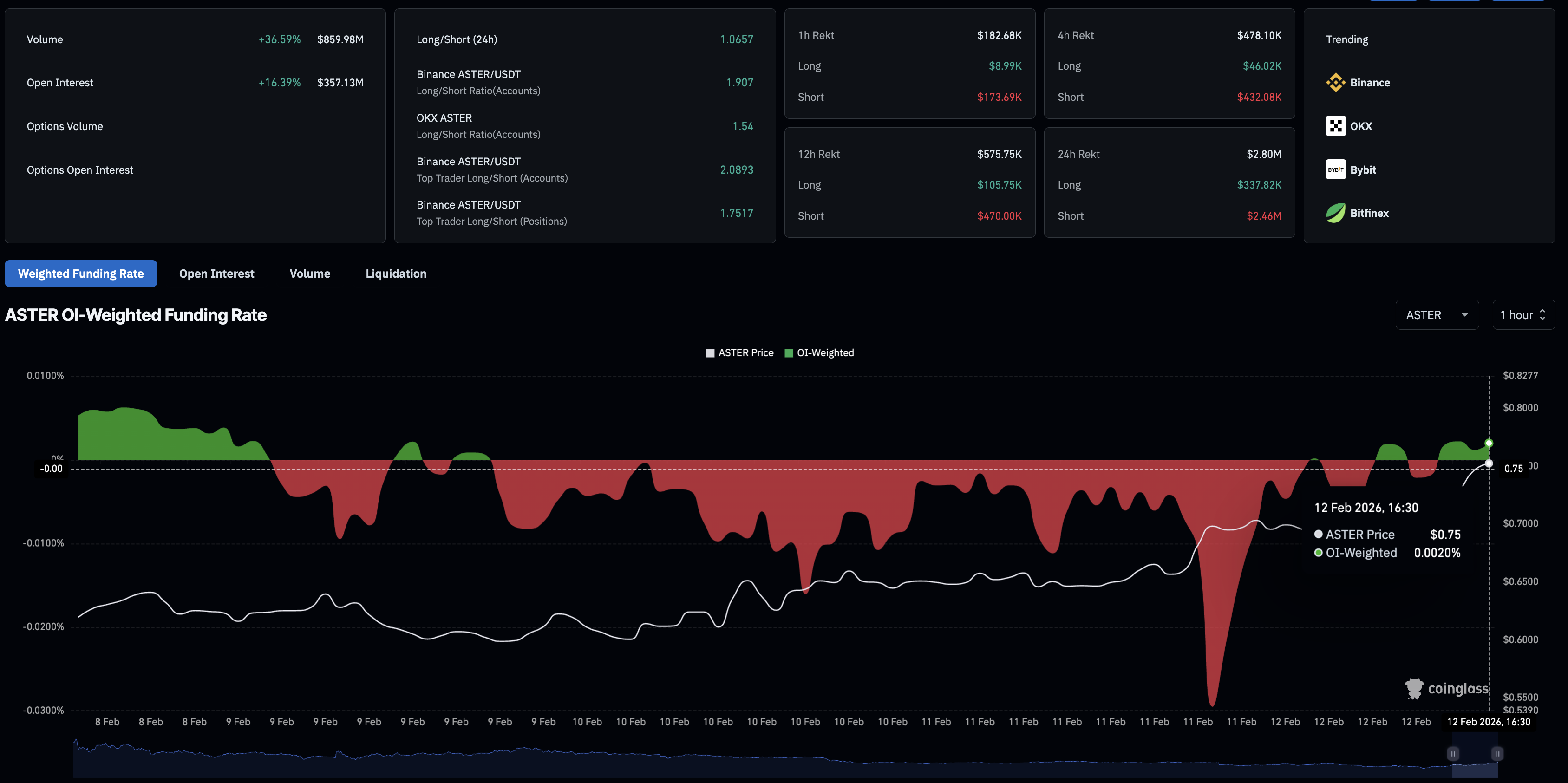 Los datos de CoinGlass muestran que el interés abierto (OI) de los futuros de $ASTER se sitúa en 357.13 millones de dólares, un aumento de más del 16% en las últimas 24 horas. Típicamente, un aumento constante en el OI durante una tendencia alcista indica flujos de capital elevados impulsados por un creciente interés de los inversores.