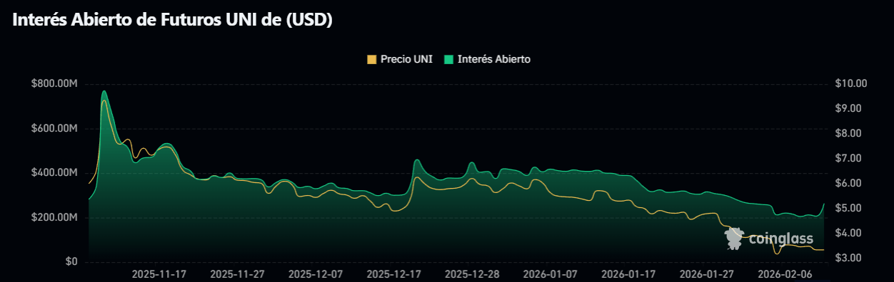 El gráfico de interés abierto (OI) de futuros de Uniswap evidencia una contracción marcada tanto en precio como en posicionamiento especulativo. Desde los máximos cercanos a los $9–$10, cuando el OI superaba los $750 millones, el activo inició una tendencia descendente sostenida que lo llevó recientemente a la zona de los $4–$5, con mínimos puntuales próximos a los $3.