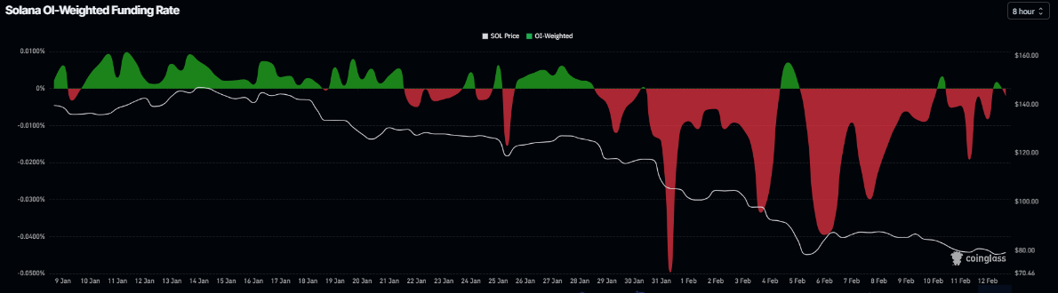 Sin embargo, los mercados de derivados señalan cautela entre los operadores. Los datos de CoinGlass muestran que la tasa de financiación de $SOL se volvió negativa el viernes, leyendo -0.0014%, lo que indica que las posiciones cortas están pagando a las largas y sugiere un sentimiento bajista.