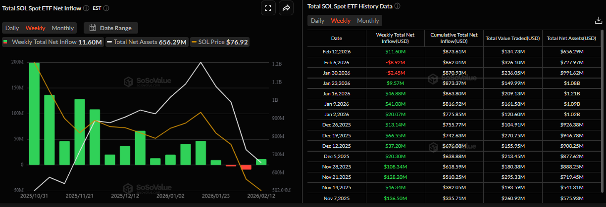 La demanda institucional por Solana regresa esta semana. Los datos de SoSoValue muestran que los fondos cotizados en bolsa (ETFs) de Solana al contado registraron entradas de 11.60 millones $ hasta el jueves, poniendo fin a dos semanas consecutivas de retiros. Si esta tendencia continúa y se intensifica, el precio de $SOL podría recuperarse en los próximos días.