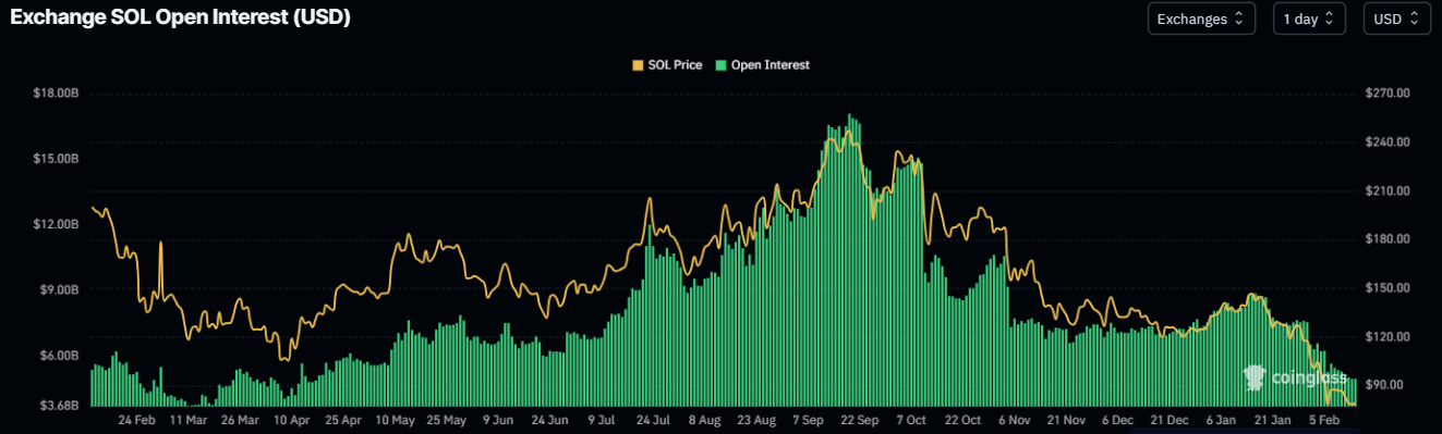 Además, el interés abierto de Solana cayó a 4.960 millones $ el viernes, disminuyendo de manera constante desde mediados de enero y alcanzando niveles no vistos desde mediados de abril de 2025. Esta caída en el interés abierto refleja una disminución en la participación de los inversores y proyecta una perspectiva bajista.