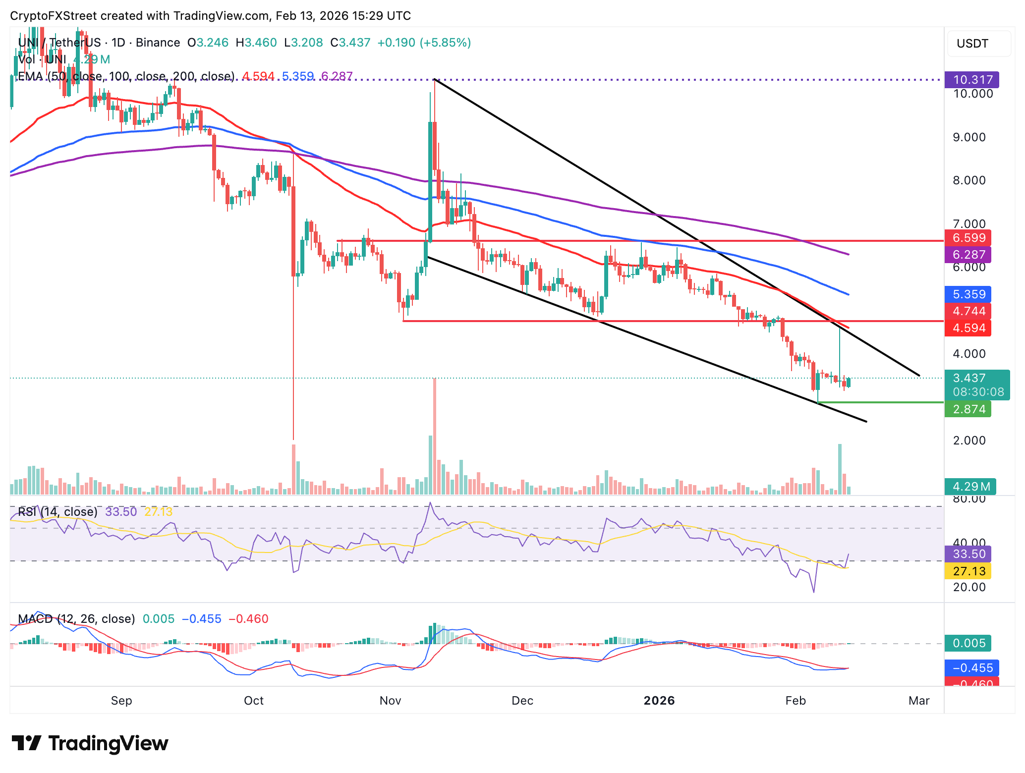 Uniswap ($UNI) sube junto a otras criptomonedas, negociándose a 3.44$ en el momento de escribir el viernes. El aumento intradía del 7% del token del intercambio descentralizado (DEX) refleja un sentimiento mejorado tras la publicación del informe del Índice de Precios al Consumidor (IPC) de enero por parte de la Oficina de Estadísticas Laborales (BLS).