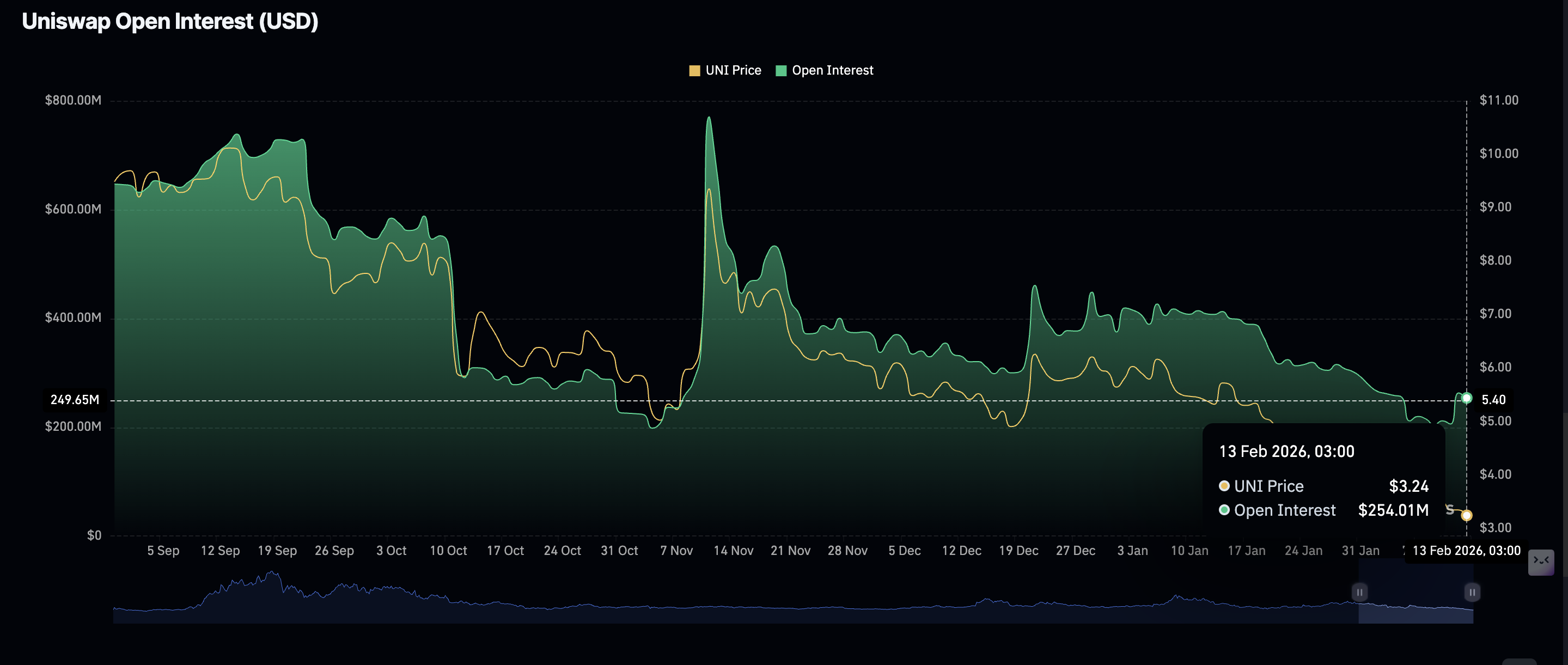 BlackRock también compró una cantidad no revelada de tokens $UNI, mejorando el sentimiento del mercado. Como resultado, la actividad de derivados se disparó, con el interés abierto de futuros (OI) alcanzando los 263 millones de dólares el martes antes de enfriarse a 253 millones de dólares el viernes. La disminución en el OI sugiere que los inversores aún no están convencidos de que $UNI pueda mantener una tendencia alcista a corto plazo.