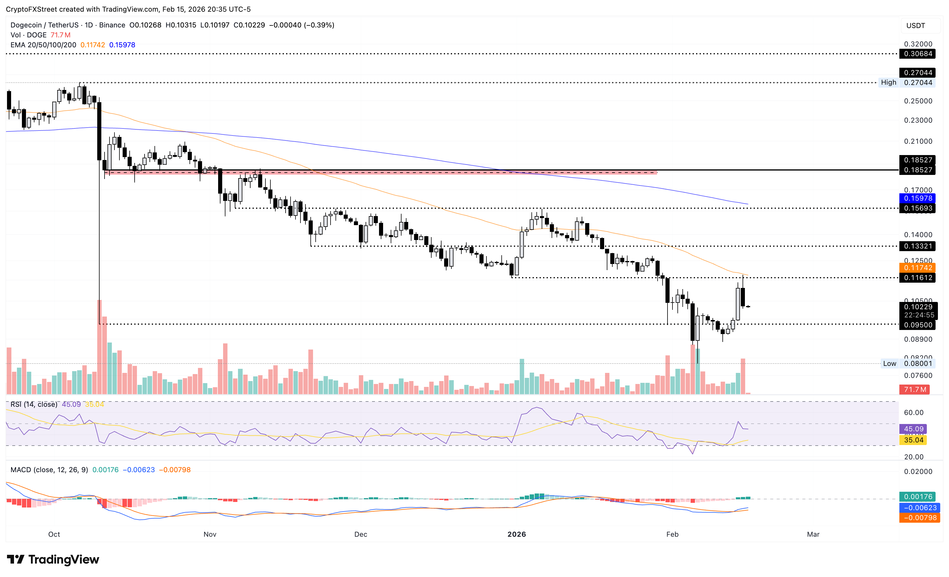 Dogecoin se está negociando por encima del nivel psicológico de 0.1000$ en el momento de escribir este artículo el lunes, manteniendo su posición por encima de este nivel tras una caída del 7% el domingo. La media móvil exponencial (EMA) de 50 días limitó las ganancias el día anterior, mientras que su pendiente descendente reafirma el sesgo bajista predominante.