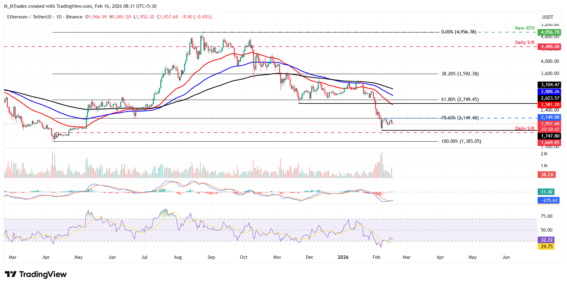 El precio de Ethereum enfrentó rechazo cerca del rango superior de consolidación en 2.149$ el domingo y cayó un 5.75% ese día. A partir del lunes, el $ETH está cotizando a 1.957$.
