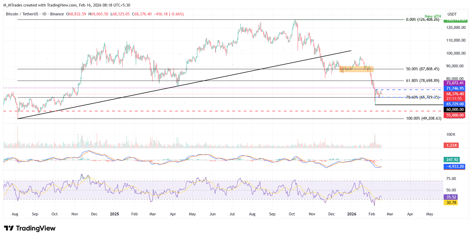 El precio del Bitcoin se ha estado consolidando entre 65.729$ y 71.746$ desde el 7 de febrero. A partir del lunes, el $BTC está cotizando en el rango de 68.376$.