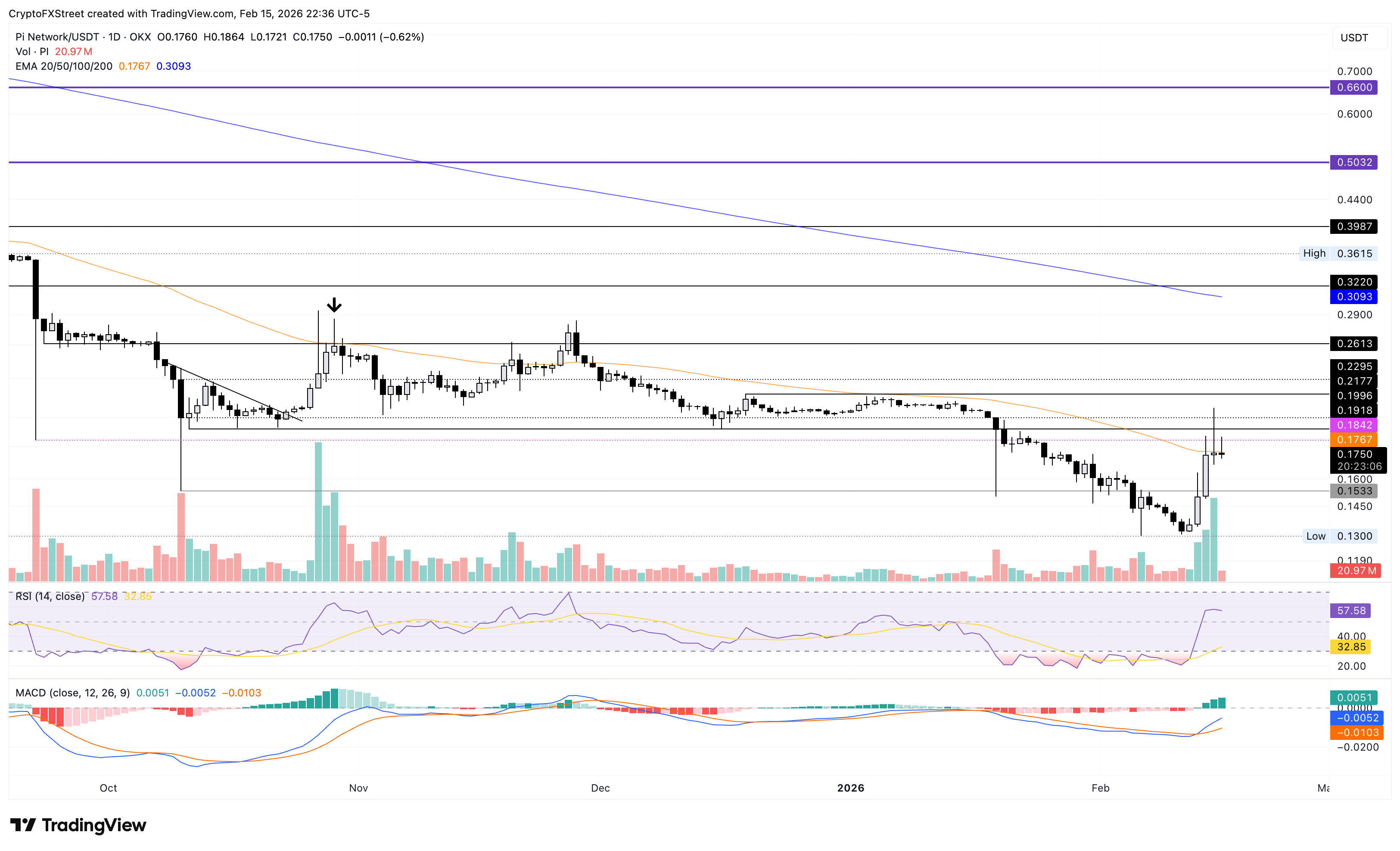 Pi Network se está negociando alrededor de 0.1750$ en el momento de escribir, luchando por extender las ganancias por encima de la EMA de 50 días en 0.1767$. El token PI se está negociando por debajo de las EMAs de 200 y 50 días, confirmando la tendencia bajista prevaleciente.