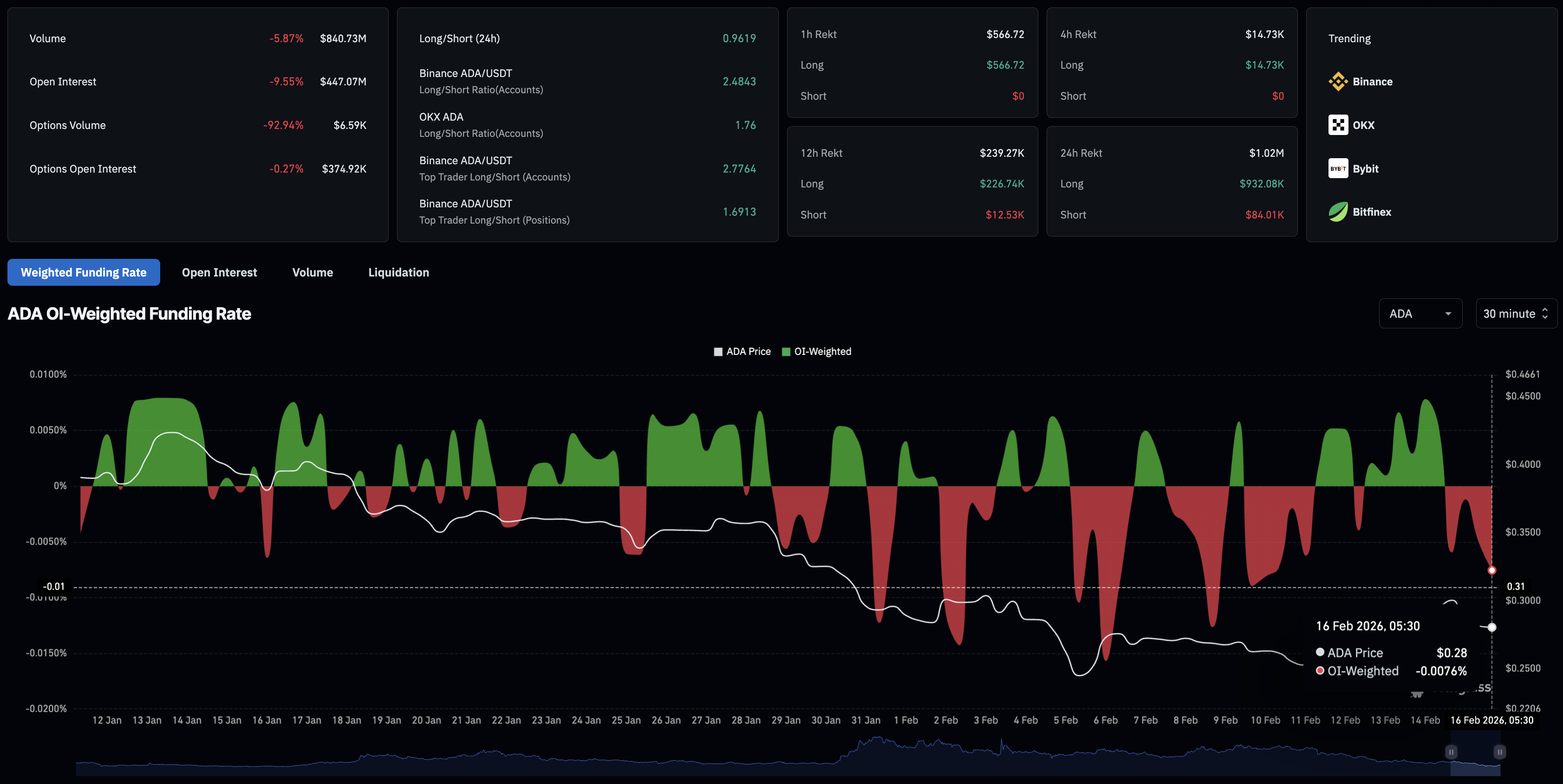Los datos de CoinGlass indican que el Interés Abierto (OI) de futuros de $ADA ha disminuido a 447.07 millones de dólares, una caída del 9.55% en las últimas 24 horas, reflejando salidas sustanciales de derivados de $ADA, probablemente desencadenadas por olas de liquidación. Durante el mismo período, las liquidaciones largas totalizaron 932.080$, significativamente más altas que las liquidaciones cortas de 84.010$, lo que sugiere una eliminación pronunciada de posiciones alcistas. Esto redujo la relación larga-corta por debajo de 1, en 0.9619, indicando un mayor número de posiciones cortas activas en los derivados de $ADA.