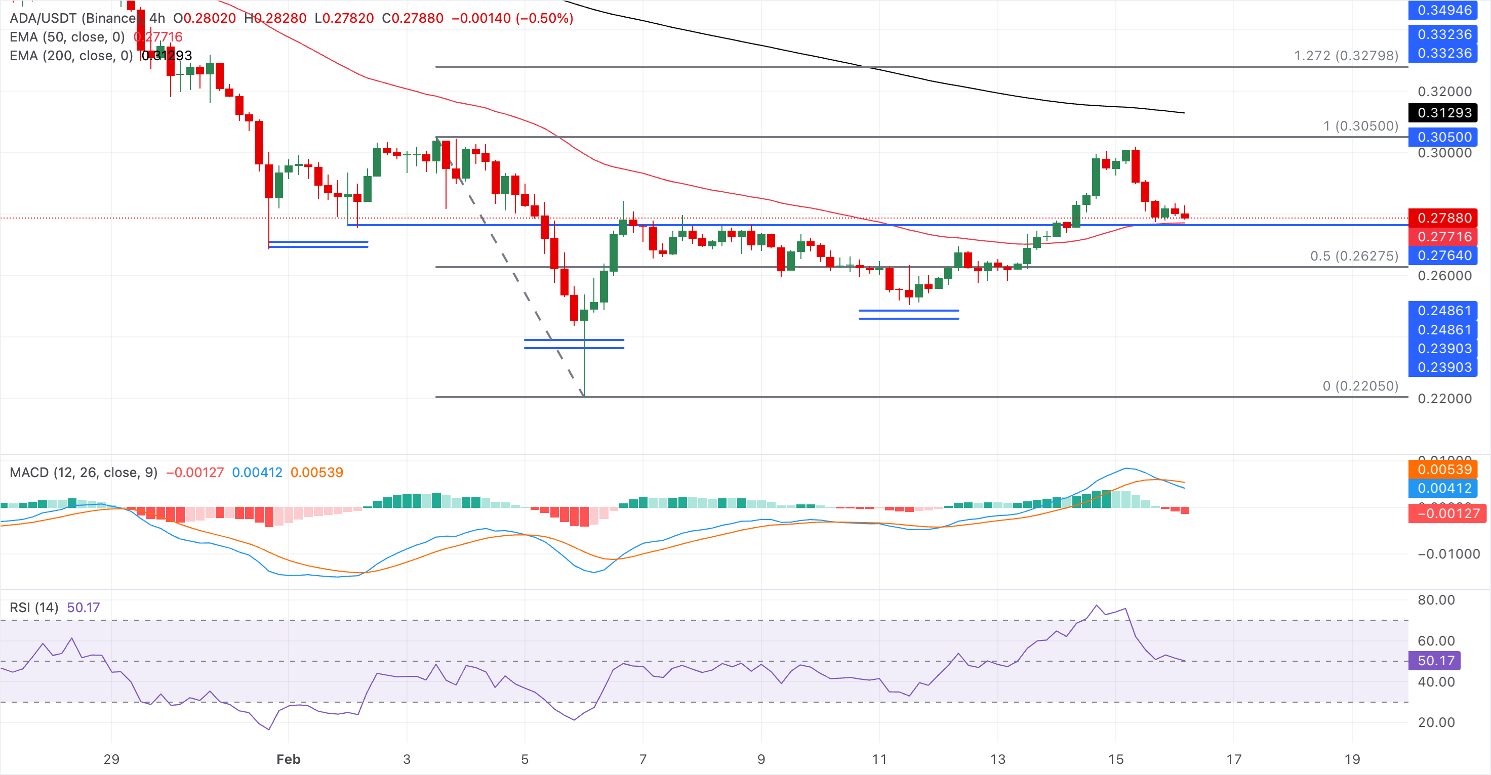 Si $ADA cae por debajo de 0.2772$, podría probar el nivel de retroceso del 50% en 0.2669$, medido desde el máximo del 3 de febrero de 0.3050$ hasta el mínimo del 6 de febrero en 0.2289$.