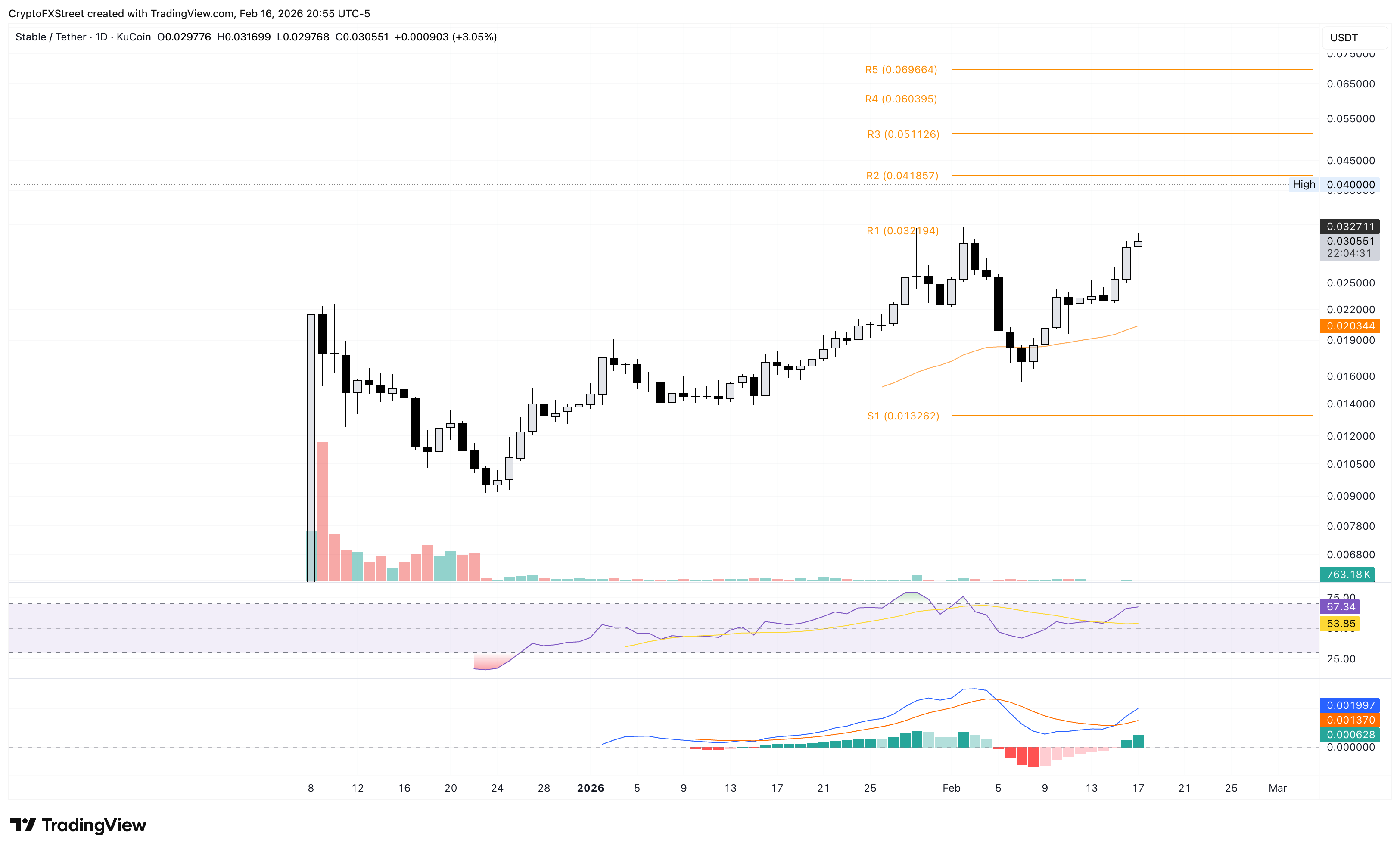 La resistencia inmediata para $STABLE se encuentra en el punto de pivote R1 en 0.03219 $. Un cierre decisivo por encima de este nivel podría extender el rally hasta el punto de pivote R2 en 0.04185 $.