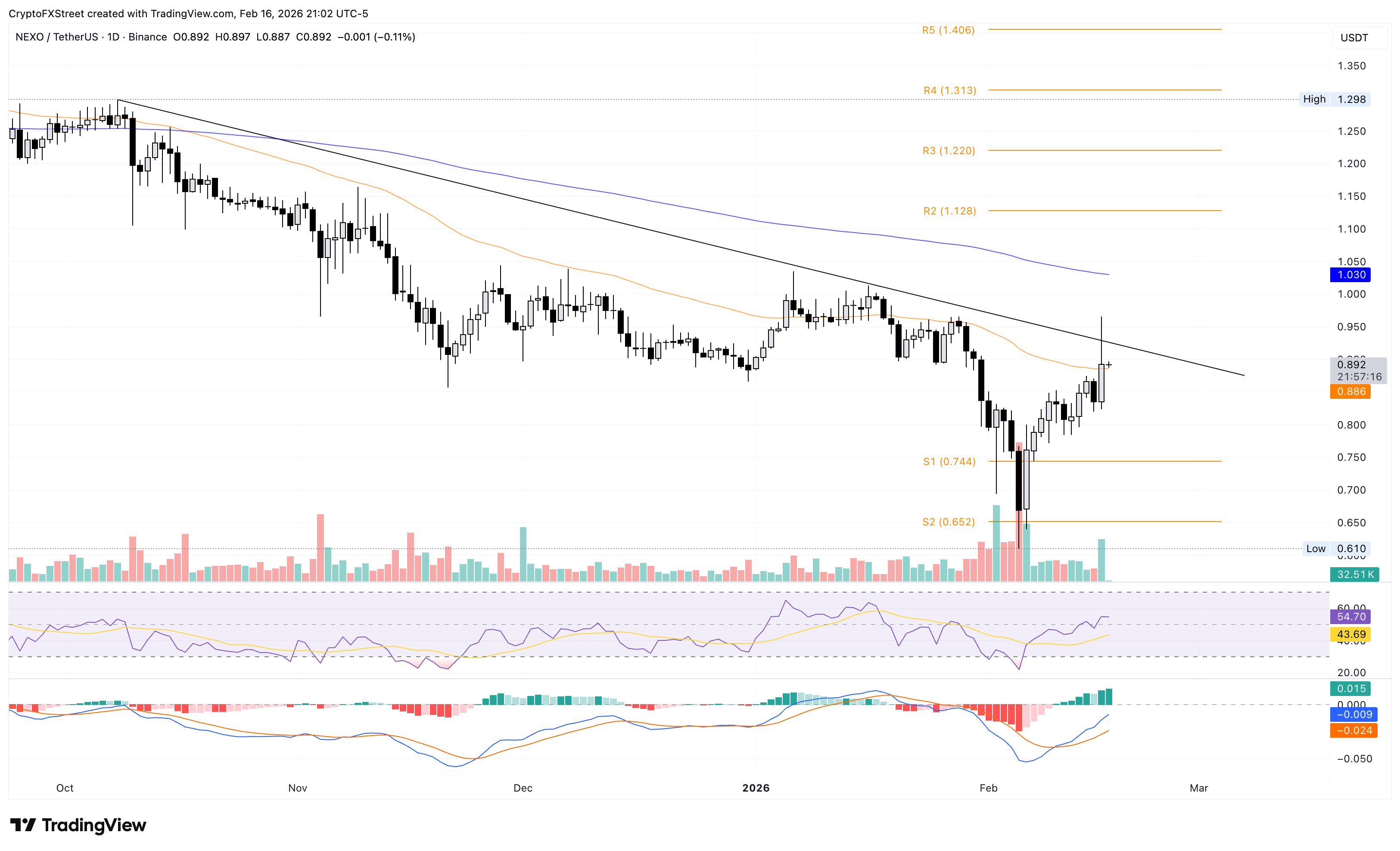 Nexo se encuentra descansando por encima de la EMA de 50 días en 0.886 $ al momento de escribir el martes, tras un salto del 7% el día anterior. La criptomoneda enfrenta resistencia superior de una línea de tendencia descendente que conecta los máximos del 8 de octubre y del 16 de enero en el gráfico diario en 0.93 $.