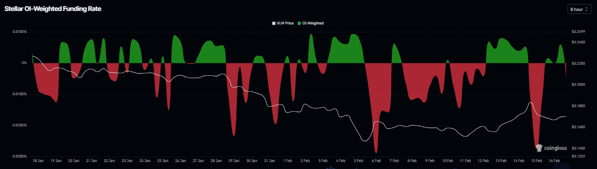 Los datos de la tasa de financiación ponderada por OI de CoinGlass muestran que el número de operadores que apuestan a que el precio de $XLM caerá más es mayor que aquellos que anticipan un aumento del precio.