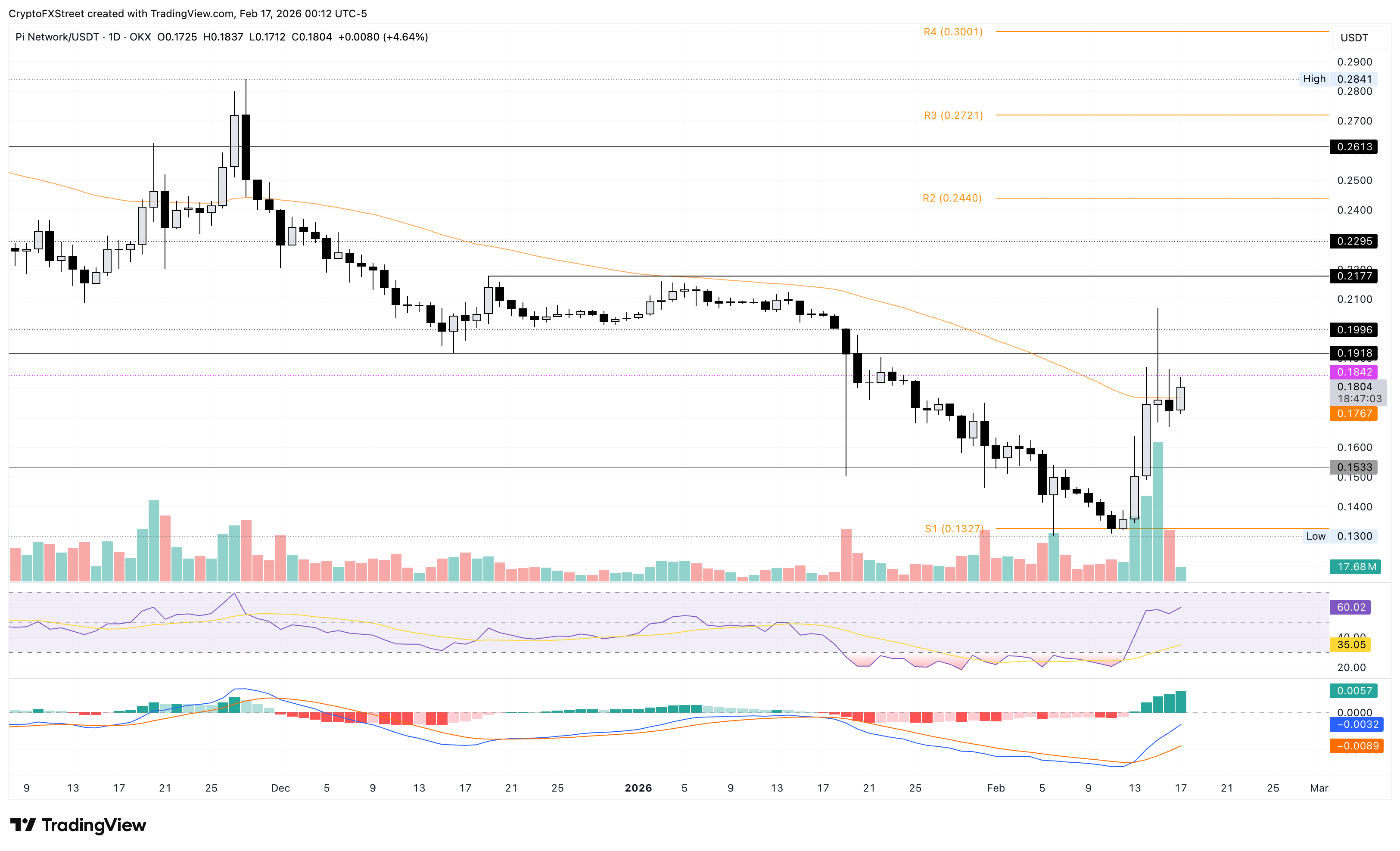 Pi Network ha mostrado una fuerte recuperación del 20% desde el jueves, rebotando en el Punto Pivote S1 en 0.1327$. La rápida recuperación en forma de V prueba la EMA de 50 días en 0.1767$ con los alcistas enfocándose en una posible ruptura.