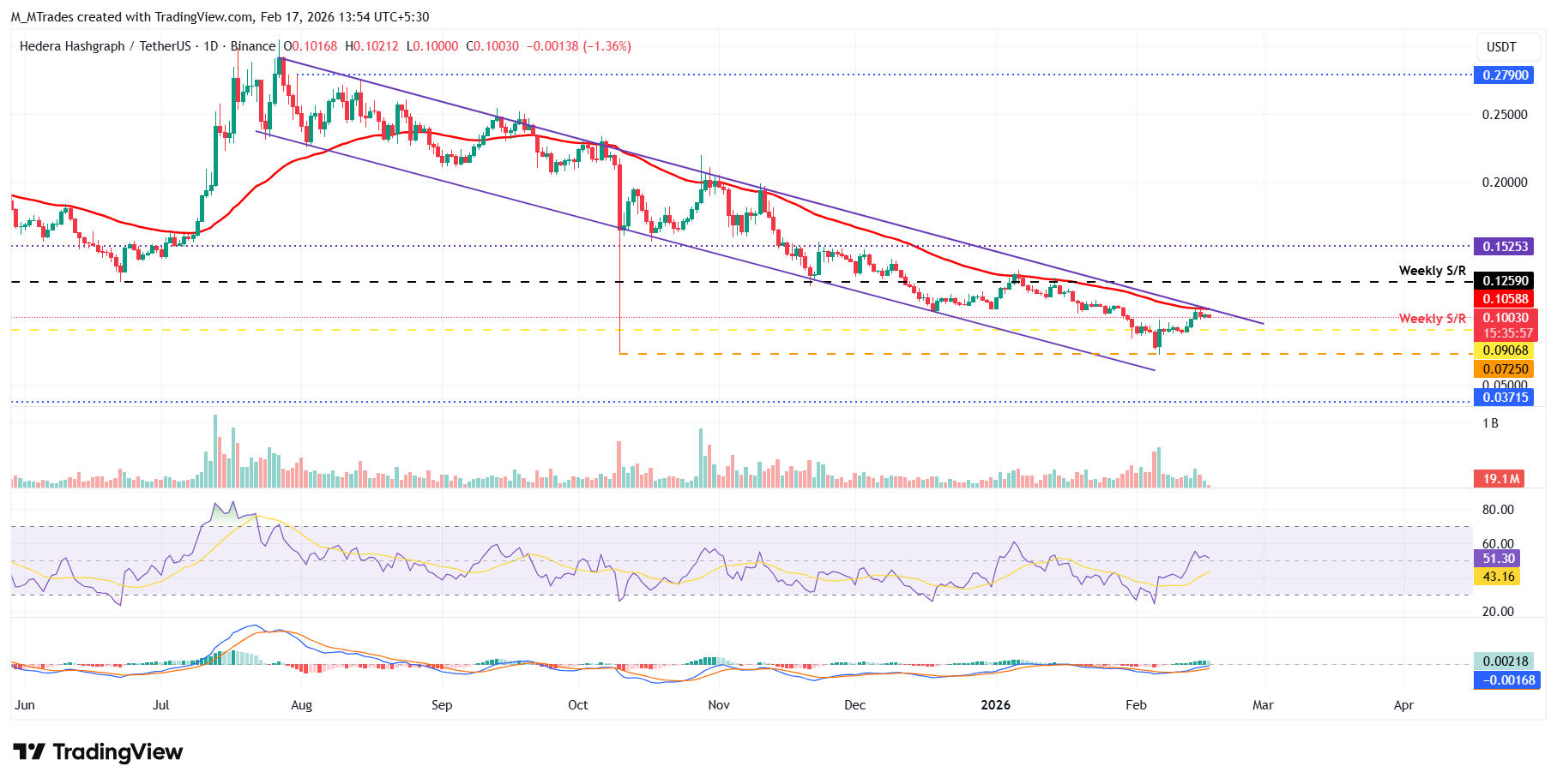 Por otro lado, si $HBAR se recupera y cierra por encima de la EMA de 50 días en 0.105$, podría extender el avance hacia la siguiente resistencia semanal en 0.125$.