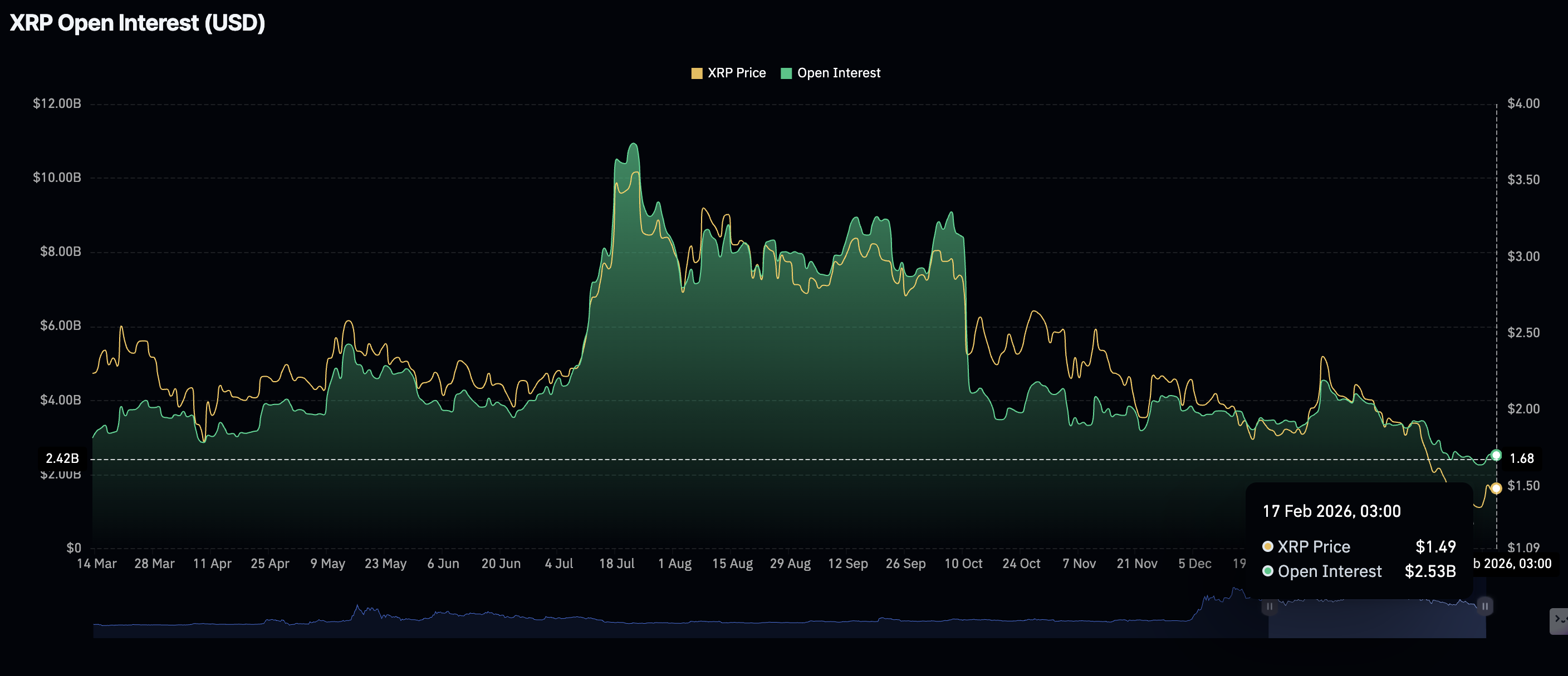 $XRP está luchando por mantener su recuperación, lo que lleva a fluctuaciones de precios volátiles a medida que el interés minorista tambalea. Después de que el Interés Abierto (OI) de futuros de $XRP aumentara a 2.56 mil millones de dólares el lunes, se reduce a 2.53 mil millones de dólares el martes, socavando el optimismo de la semana pasada que impulsó el precio a 1.67$ el domingo.